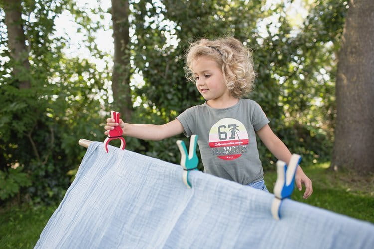Spinacze BS Toys Buiten Speel przychodzą z pomocą tam, gdzie trzeba przymocować koc czy prześcieradło, aby powstała wymarzona kryjówka lub namiot. Koniec z obkładaniem kawałków materiału kamieniami czy książkami. Spinacz jest wygodniejszy i bezpieczniejszy, a do tego kolorowy, więc konstrukcja wygląda po prostu ładniej. Co jeszcze? Zajmuje mało miejsca, więc spokojnie zabierzesz go na wakacje, a i w domu nieraz się pewnie przyda.