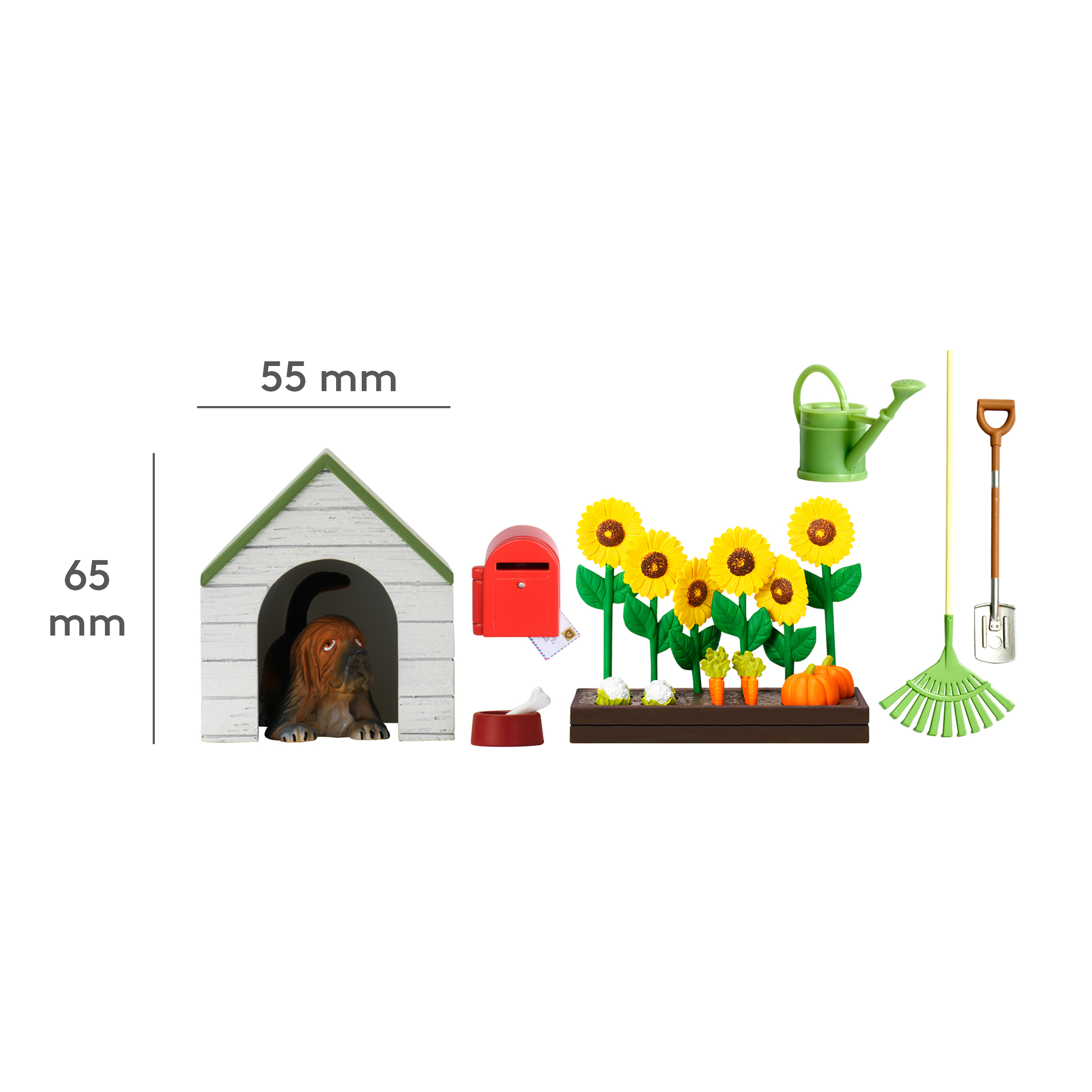 Bujny ogród warzywny z warzywami i kwitnącymi słonecznikami, skrzynka pocztowa z listami, w których z pewnością nie ma niechcianych rachunków, grabie, łopata i konewka, a także słodki pies, który ma miskę z kością i mieszka w uroczej budzie sprawią, że zakochasz się w tym dodatku do domku dla lalek!