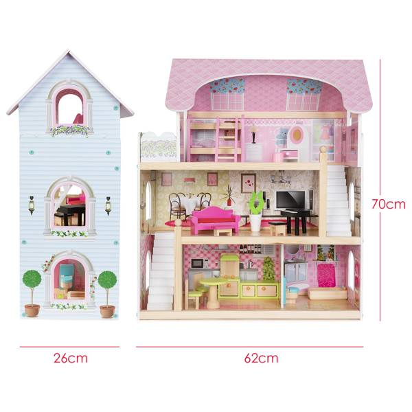 - Drewniany solidny domek dla lalek o wymiarach 70 x 62 x 26 cm a w nim: