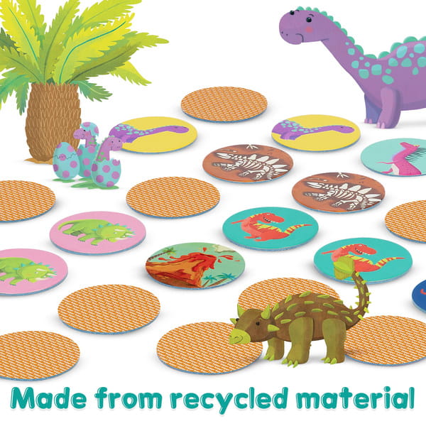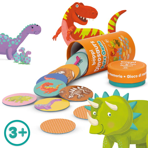 Boppi, układanka w pary memo Dinozaury to wspaniała, edukacyjna gra memo. Super sprawdzi się także w podróży. Gra ćwiczy koncentrację i pamięć oraz logiczne myślenie. Dzieci muszą starać się zapamiętać gdzie były odkładane karty z ilustracjami dinozaurów, aby potem jak najszybciej znaleźć właściwą parę.