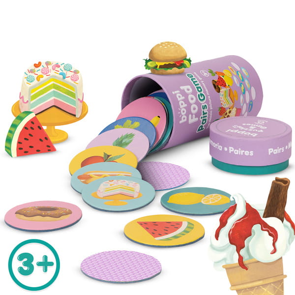 Boppi, układanka w pary memo Jedzenie to wspaniała, edukacyjna gra memo. Super sprawdzi się także w podróży. Gra ćwiczy koncentrację i pamięć oraz logiczne myślenie. Dzieci muszą starać się zapamiętać gdzie były odkładane karty z ilustracjami owoców, warzyw i różnych smakołyków, aby potem jak najszybciej znaleźć właściwą parę.