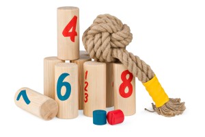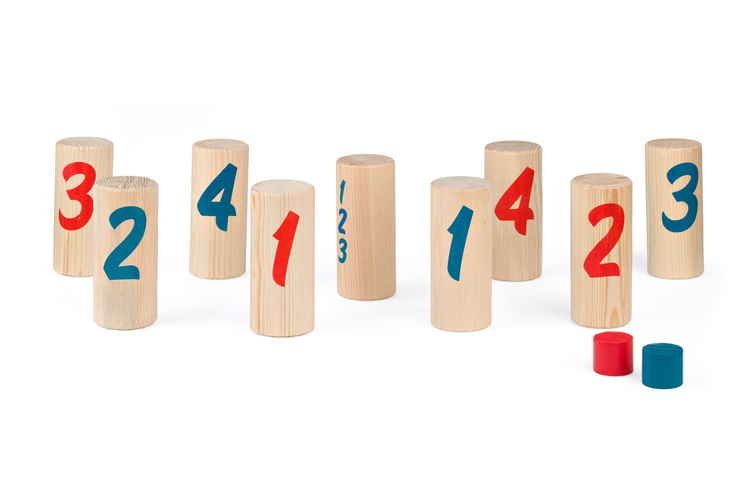 - Drużyna czerwona i niebieska na zmianę rzucają zawiązaną pałką starając się przewrócić piny.