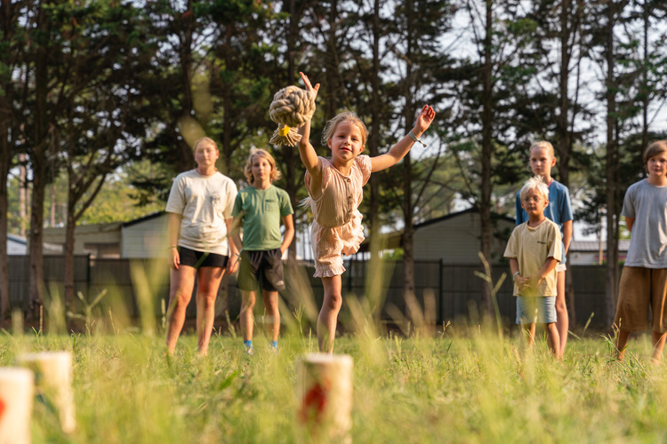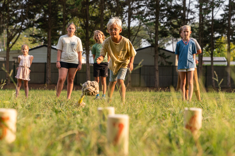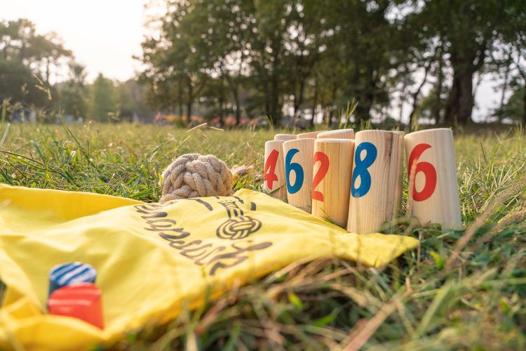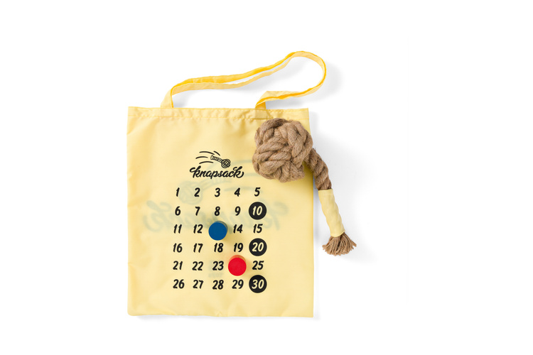 - Połóż worek (tablicę punktów) w odległości 4-5 metrów/ kroków od pinów. To wyznacza miejsce rzutu dla obu drużyn.