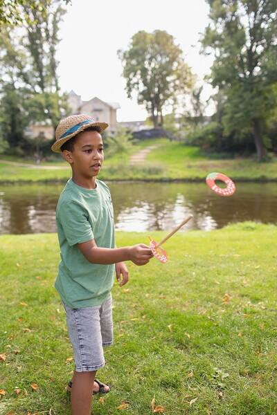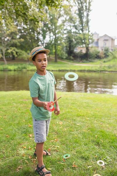 Rzucaj obręczami tak, by zaczepiły się na pionowych bolcach i zbieraj punkty. Odległość, z której zawodnicy będą rzucać należy oczywiście dostosować do ich wieku.