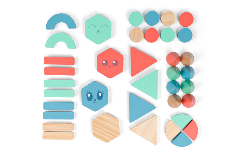 W zestawie znajduje się 38 klocków w różnych kształtach.