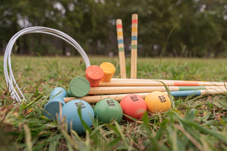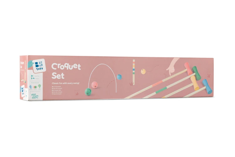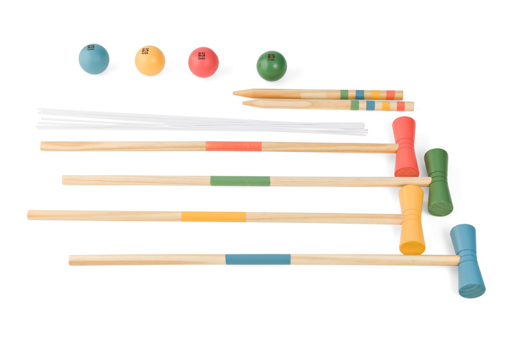 W zestawie znajdują się: 4 kije 57 x 10 x 3,5 cm, 2 kije 27,5 x 1,5 x 1,5 cm, 10 metalowych łuków 52 cm, kula o średnicy 5 cm.
