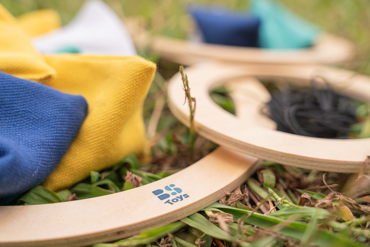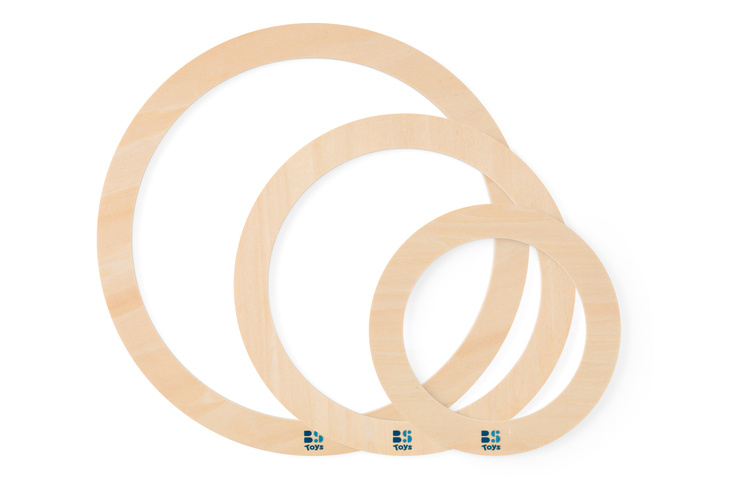 W zestawie znajduje się: 3 drewniane obręcze o średnicy 25, 19, 14 cm, 12 materiałowych woreczków 6 x 6 x 6 cm, 1 sznurek - 3 m, torba.