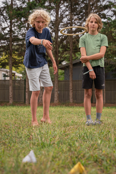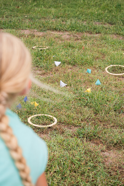 - Ustaw trzy drewniane obręcze około 3 metry (10 kroków) od linii rzutu, tworząc trójkąt.