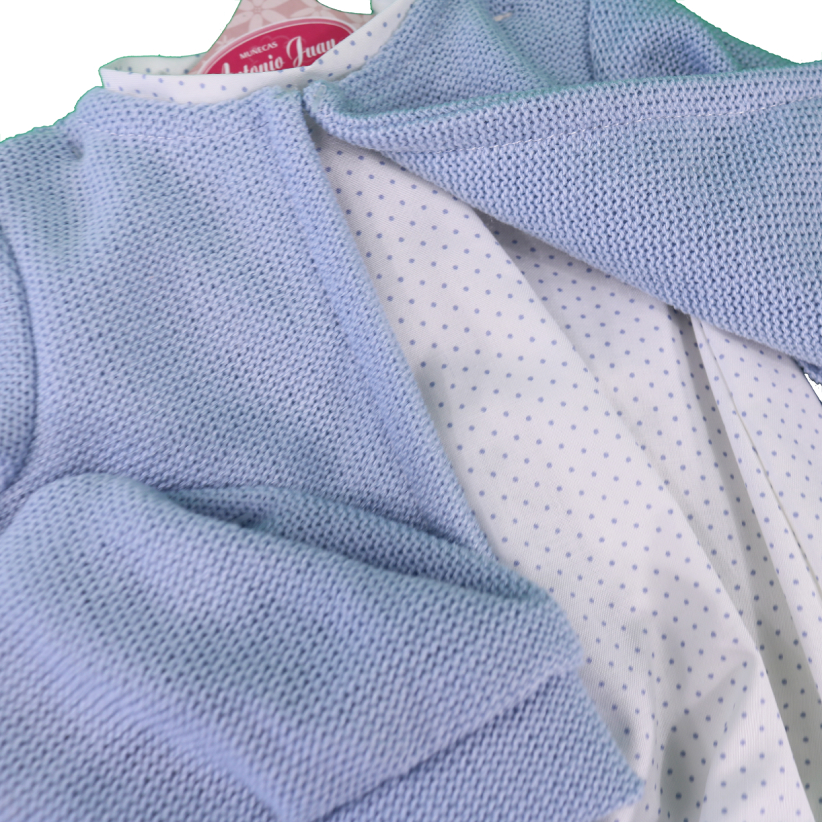 Idealny dla bobasów o wysokości ok. 40-42 cm komplet ubranek cenionej marki Antonio Juan urzeka klasycznym designem i modnym wzorem w delikatne groszki. Bawełniane body z krótkim rękawem, zapinane z tyłu na rzep perfekcyjnie komponuje się z dzianinowym, niebieskim bolerkiem. W wysokiej jakości, szytym ręcznie zestawie znajduje się także pasująca do całości czapeczka udekorowana elegancką kokardką.