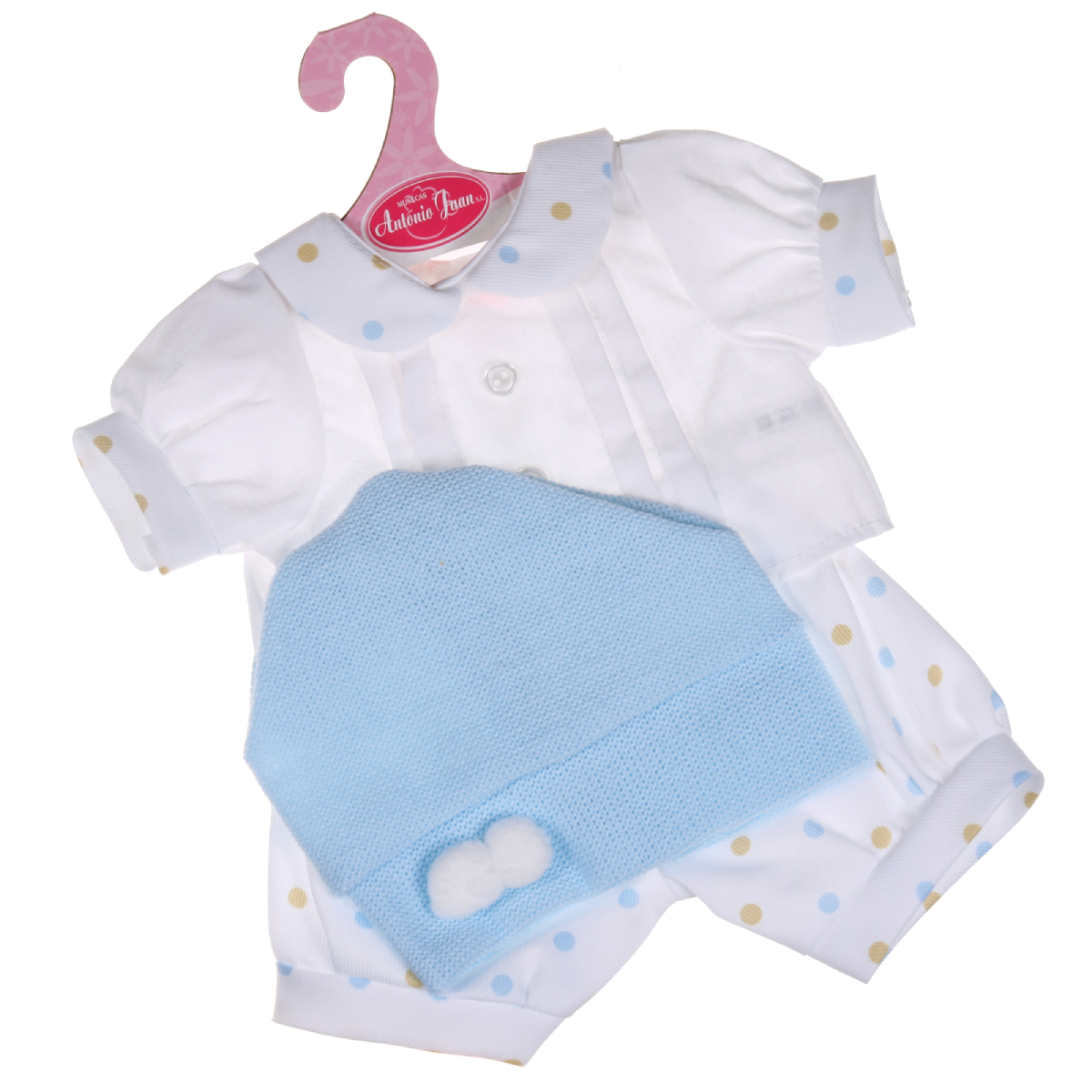 Biały komplet w groszki to kolejny zestaw oferowany przez markę Antonio Juan, przeznaczone dla lalki o wysokości 42 cm. Komplet posiada krótki rękaw. Strój składa się z eleganckiej białej koszuli, która zapinana jest z tyłu na rzepę oraz eleganckich bufiastych spodenek, które są gumce. Koszulę ozdabia przyszyty guziczek oraz materiałowe zakładki umieszczone na środku ubranka. Dekorację ubranka stanowi kołnierzyk oraz mankiety w żółto-niebieskie kropeczki. Dodatkowo komplet wyposażono w niebieską czapkę wykonaną z dzianiny, do której przyszyte zostały dwa białe mięciutkie pomponiki. Dzięki posiadaniu w swojej garderobie takich dodatków kolekcja zostanie urozmaicona, a tworzone stylizacje będą coraz to piękniejsze.