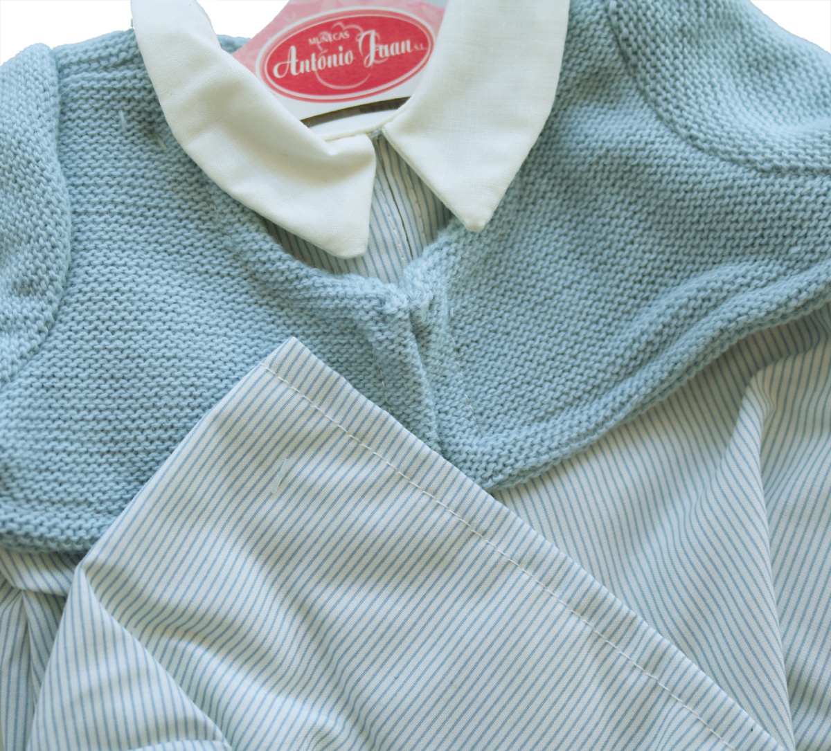 Urocze body w paski ze sweterkiem to propozycja od marki Antonio Juan do kolekcji ubrań lalki o wysokości 42 cm. Zestaw zawiera białe body z krótkim rękawkiem oraz ciepłe bolerko na długi rękaw. Przyszyty do rampersa biały kołnierzyk oraz materiałowe wstawki stanowiące zakończenie rękawków sprawią, że strój wygląda elegancko. Elementem uzupełniającym strój jest wiązana czapeczka przyozdobiona białą atłasową tasiemką. Okrycie głowy ozdobiono wzorem w delikatne niebieskie paski. W całości komplet został wykonany z przyjemnego w dotyku materiału. Za sprawą umieszczonego w rampersach zapięciu na rzepę, młoda dama nie będzie miała problemu z ubieraniem lali, a zabawa będzie trwała jak najdłużej. Tak skompletowany zestaw idealnie sprawdzi się w chłodniejsze dni podczas wyjścia na spacer.