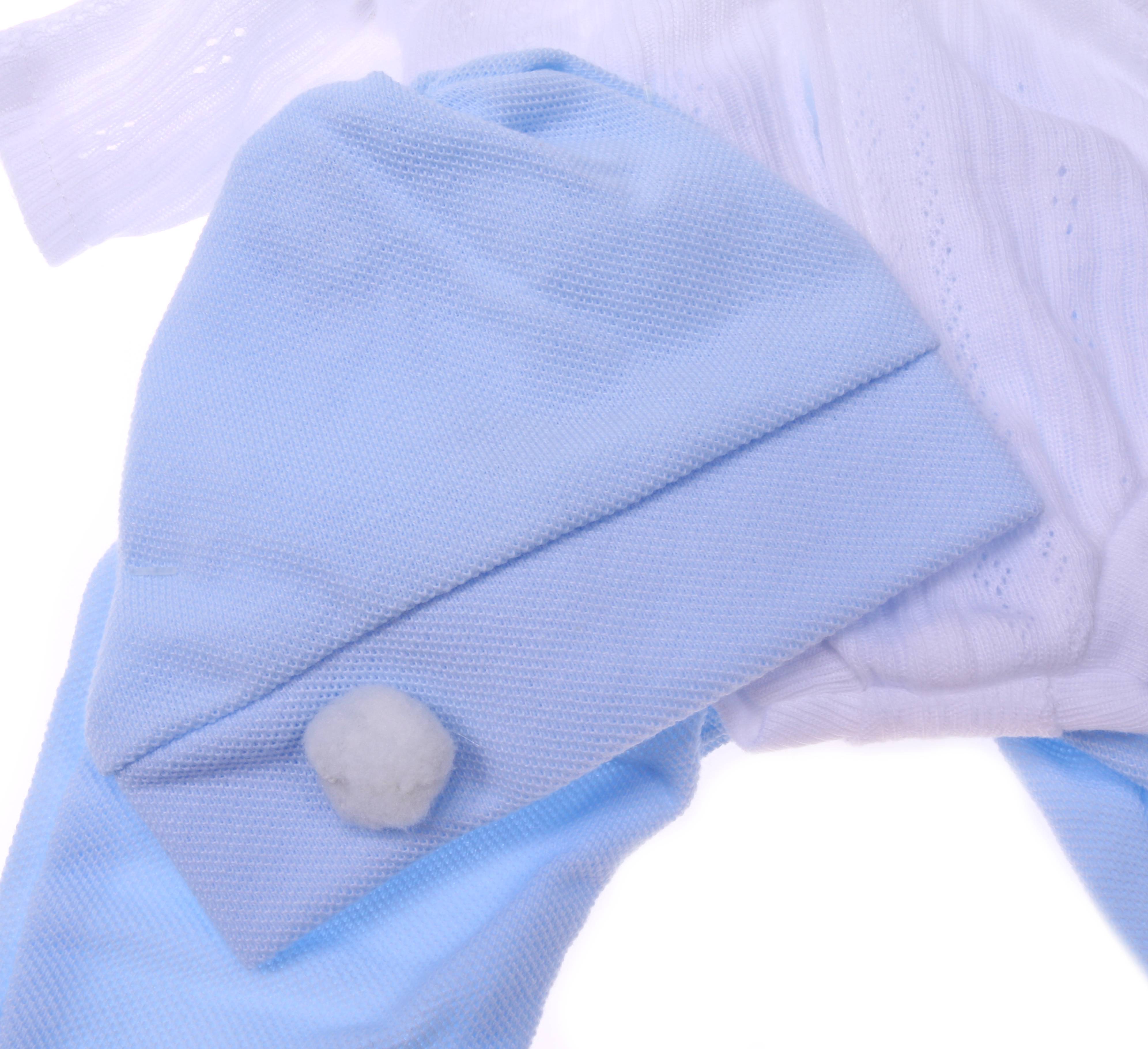 Body z niebieskimi spodenkami to zestaw ubranek odpowiedni dla lalki o wysokości 33 cm proponowany od Antonio Juan. Komplet składa się z białych bodów z długim rękawkiem oraz błękitnych spodenek uszytych ze stópkami. Strój uzupełnia wsuwana czapka z pomponem w tym samym kolorze i wzorze, co śpioszki.