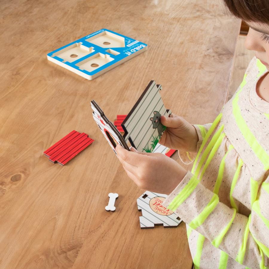 Buda dla psa to układanka 3D od Fat Brain Toys - solidne, drewniane elementy są z jednej strony kolorowe, a z drugiej mają rysunek architektoniczny - postępuj zgodnie z planem architekta i zbuduj domek dla pieska. Po skończonej zabawie odłóż elementy na drewnianą planszę, która stanowi niejako plan architektoniczny.