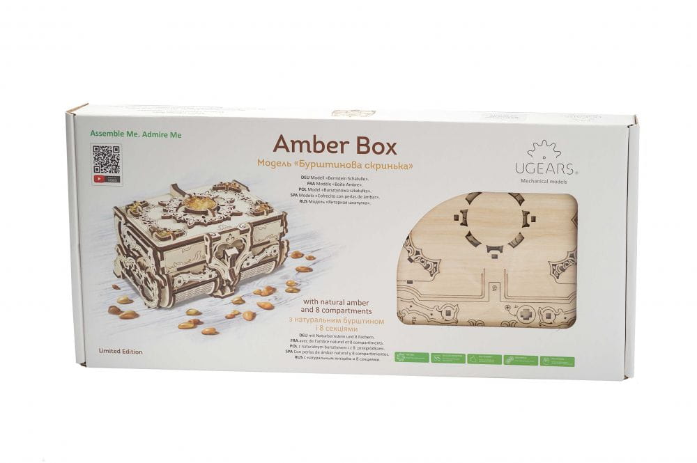 Bursztynowa szkatułka Ugears z 8 przegródkami na Twoje skarby, od Antycznej szkatułki Ugears różni się jedynie bursztynowymi inkrustacjami na wieku, sam mechanizm, budowa i pozostałe parametry są identyczne w obu modelach.