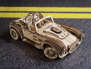 Samochód wyścigowy Cobra Drift Racing Car od Ugears. Wykonane z dbałością o szczegóły drewniane puzzle mechaniczne 3D, 370 elementów - poziom trudności: ciężko.