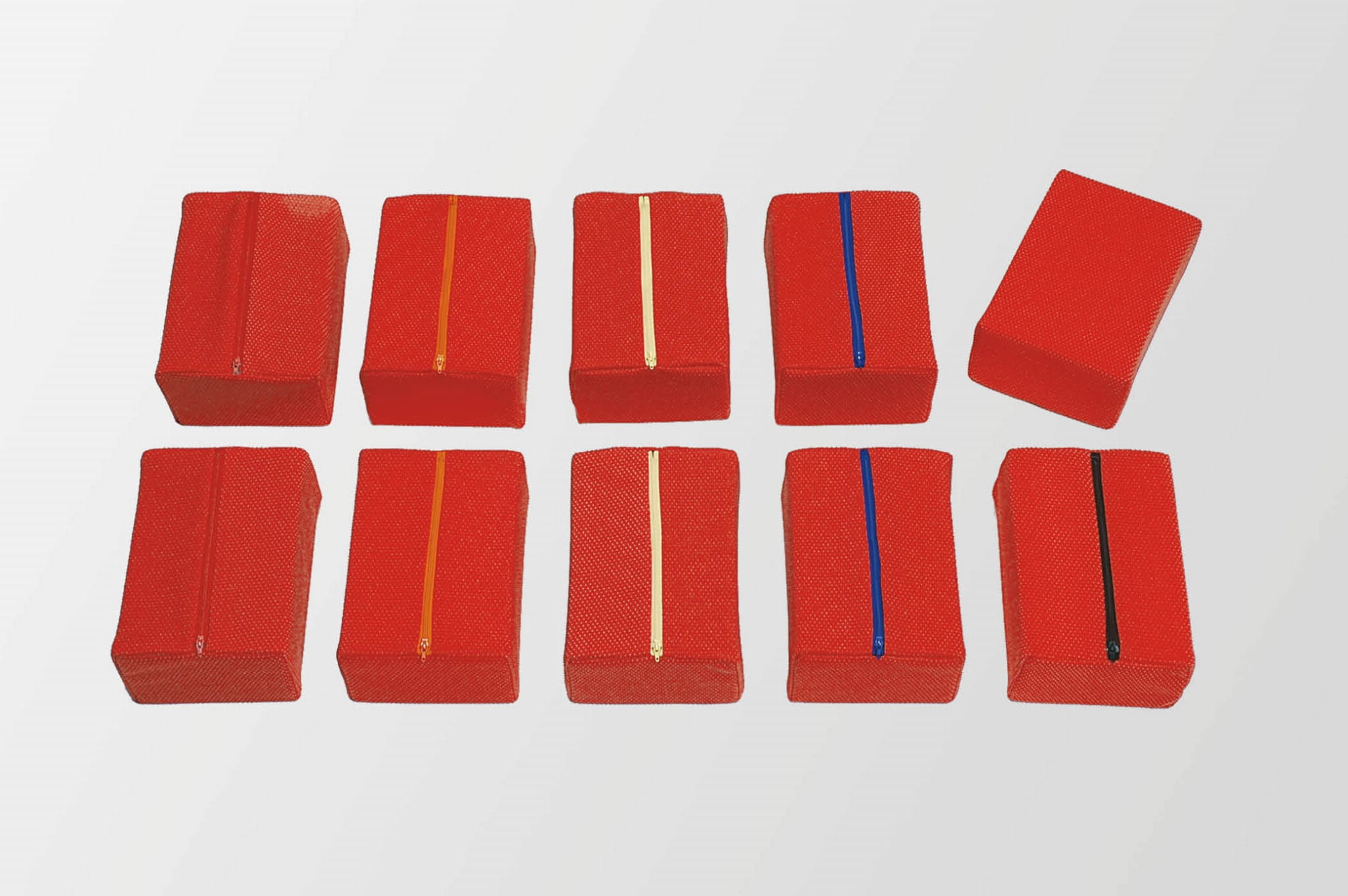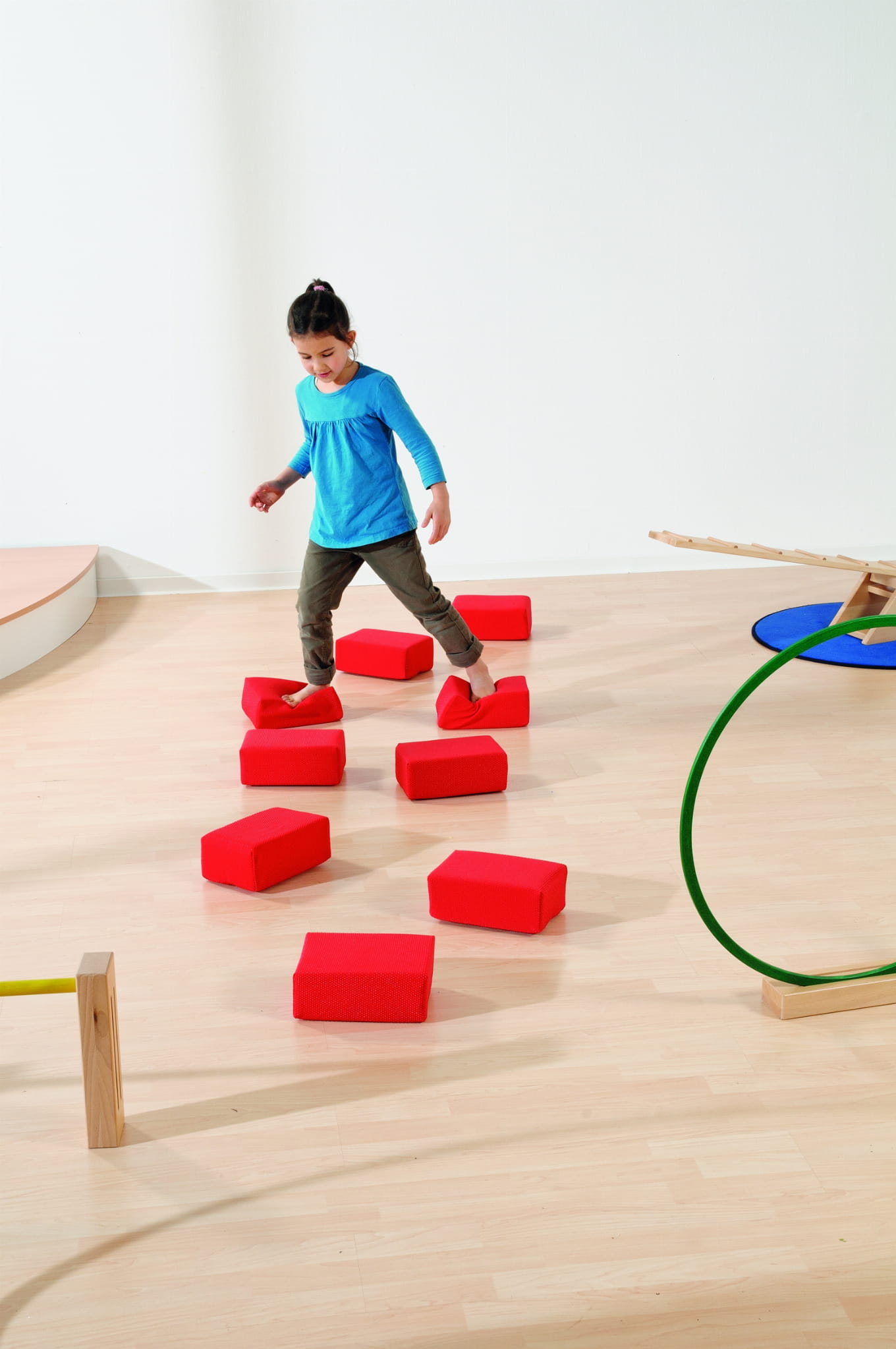 Sensoryczne memory, za pomocą rąk lub stóp dziecko odnajduje pasujące pary czerwonych poduszek. Dziecko naciskając rękoma lub stopami czerwonych poduszek dostrzega, że mają różne poziomy oporu. Zadaniem jest znalezienie tej samej miękkości/ twardości czerwonych poduszek. Każda czerwona poduszka ma parę o tej samej miękkości/twardości. Zadaniem dziecka jest znalezienie odpowiedniej pary. Czy para do siebie pasuje sprawdzamy odwracając czerwoną poduszę, gdzie znajdują się błyskawiczne zamki, jeśli są tego samego koloru dziecko dobrze dopasowało parę.