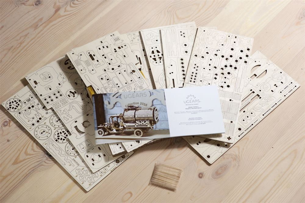Drewniane puzzle 3D marki Ugears wiernie naśladują rzeczywiste mechanizmy. Poszczególne elementy są wykonane ze sklejki i wystarczy je wycisnąć i delikatnie przetrzeć papierem ściernym, aby otrzymać idealnie dopasowane do reszty detale. Dbałość o szczegóły na etapie produkcji, zapewnia prawdziwą przyjemność podczas składania oraz satysfakcję z wyglądu i funkcjonalności gotowego mechanizmu.