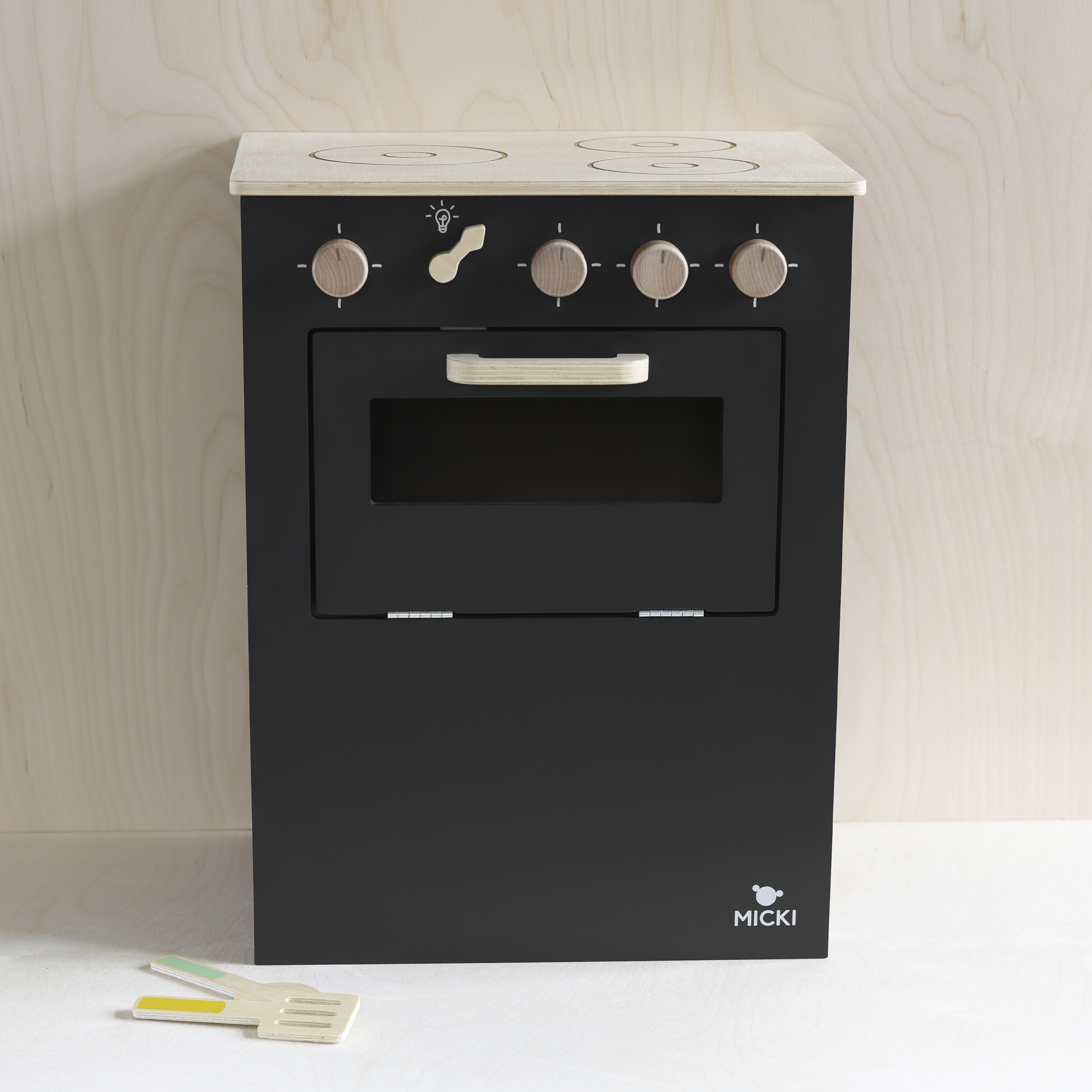 Klasyczna drewniana kuchnia do zabawy w stylu skandynawskim marki Micki z serii Premium zachwyci wszystkich małych szefów i szefowe kuchni! Ta czarna kuchenka ma grawerowane detale, 4 naturalne drewniane obracające się klikające pokrętła, drewniany blat, 3 palniki, piekarnik z otwieranymi i zamykającymi się na magnes drzwiczkami z półką w środku, a także przełącznik w kształcie strzałki. Zabawka przeniesie Twoje dziecko w fascynujący świat kulinarnych eksperymentów i zainicjuje nowe scenariusze zabawy. Dzięki niej dzieci mogą rozwijać swoją wyobraźnię, snuć smaczne wizje i zdobywać kulinarne umiejętności!