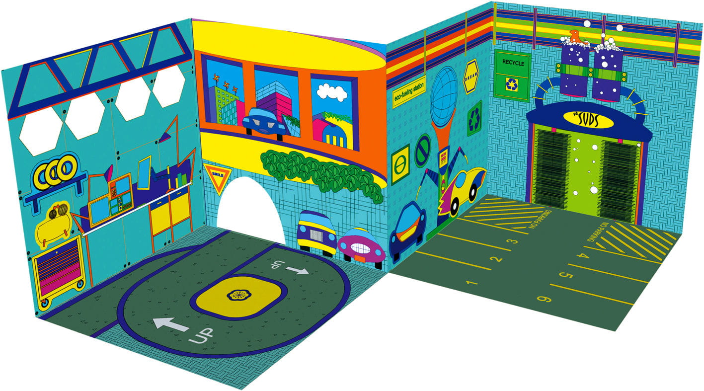 Rozkładana scenografia jest wykonana z wysokiej jakości 100 % recyclingowej tektury.