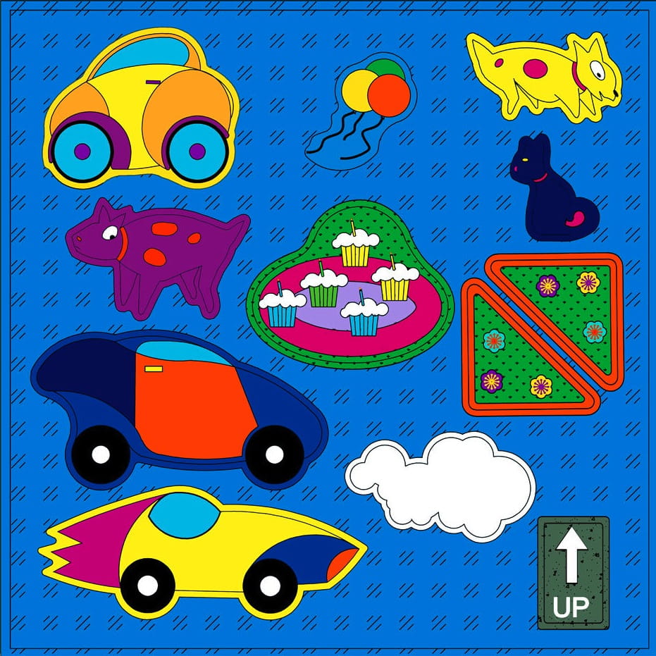 Zestaw zawiera: 1 rozkładaną scenografię, 6 kolorowych arkuszy z postaciami i elementami wystroju scenografii (ponad 70 naklejek: przedmioty, samochody, postaci).