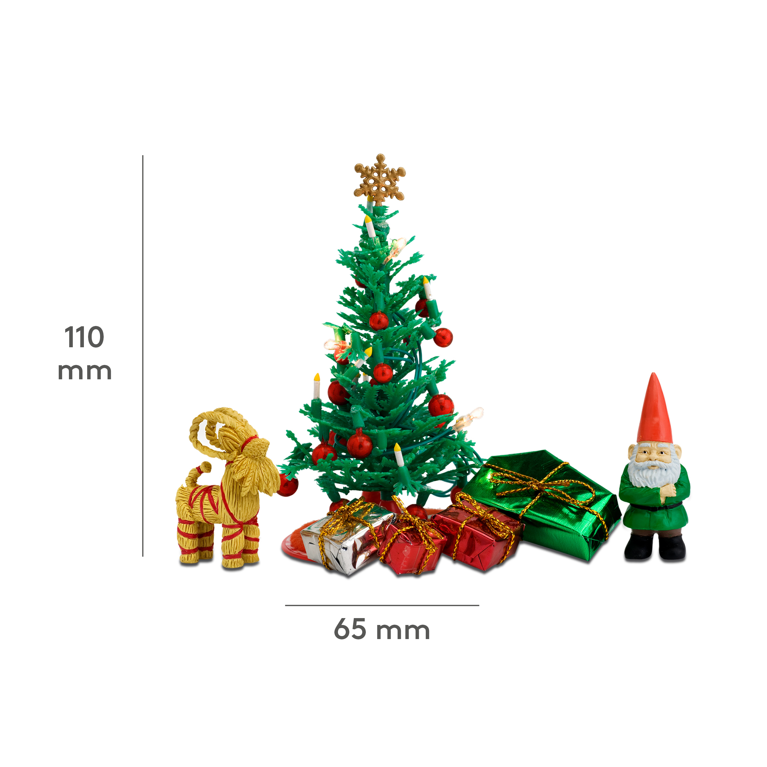 Zawiera pięknie przystrojoną choinkę z podstawą, skrzata, tradycyjnego skandynawskiego baranka i cztery zapakowane w błyszczący papier prezenty. Choinka ma prawdziwe oświetlenie LED z wbudowanym timerem, które włącza się jednym kliknięciem, a po 15 minutach wyłączą się automatycznie.
