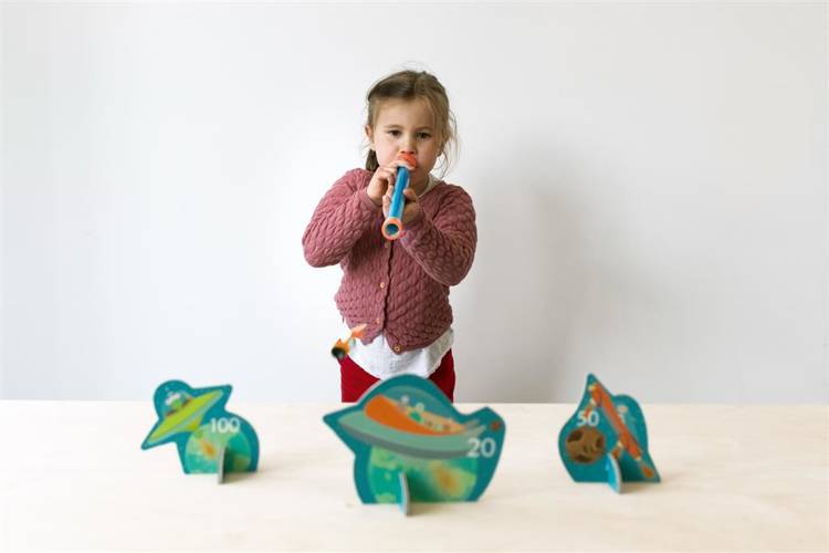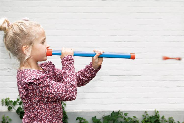 Jak się bawić? Bardzo proste . Włóż lotkę w otwór dmuchawki, przyłóż dmuchawkę czerwonym otworem do ust, wyceluj, nabierz duuuużo powietrza i dmuuuuchaj. Odległość zależy od siły naszego dmuchnięcia. Można grać na dworze i w pomieszczeniu, ustawiając cele w dowolnym miejscu. Cele mają punkty więc możesz je zliczać i sprawdzić kto wygrał.