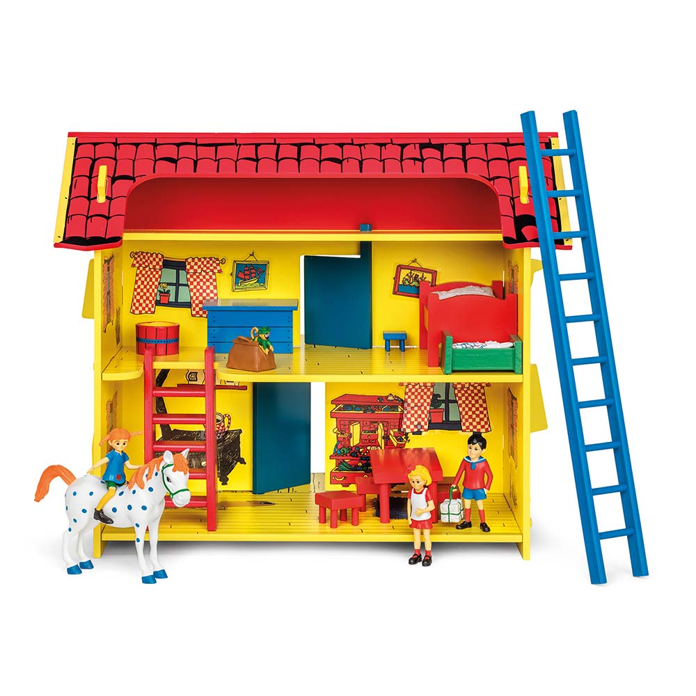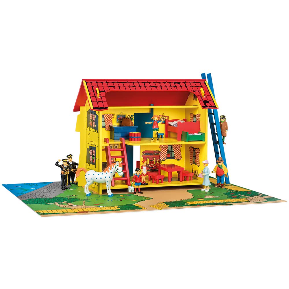 Willa Śmiesznotka, domek Pippiu ze schodami wewnętrznymi, drabinką i matą do zabawy. Dom dla lalek z zasłonami, obrazami i naklejkami z piekarnikiem.