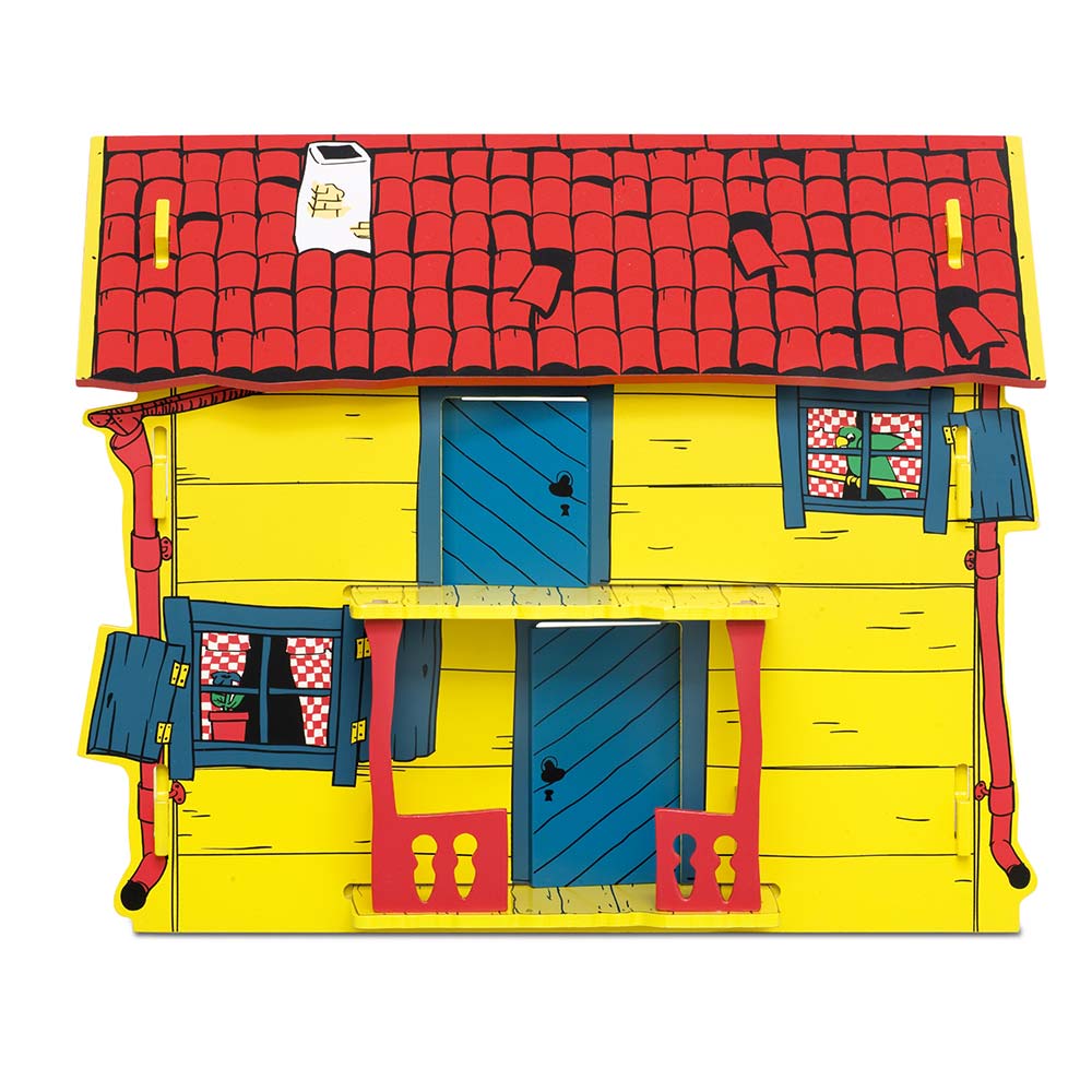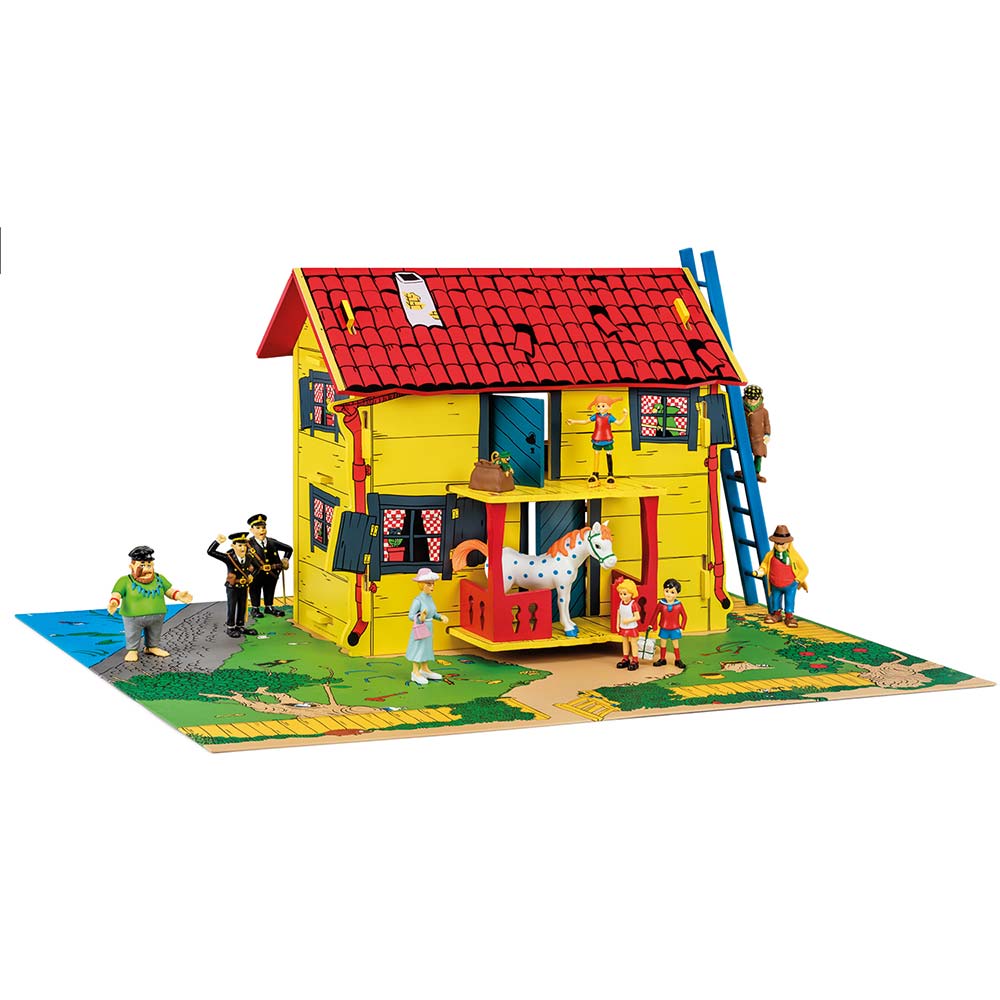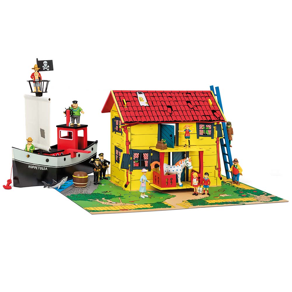Zestaw ten zawiera inspirujący domek zabaw, który jest łatwy do zbudowania i rozebrania. Domek zawiera wewnętrzne schody, drabinę i kartonowy matę przedstawiającą ogród Pippi. Otrzymasz także arkusz naklejek z zasłonami, obrazkami i kuchenką. Domek jest wykonany z drewna. (Figurki i meble są sprzedawane osobno.)