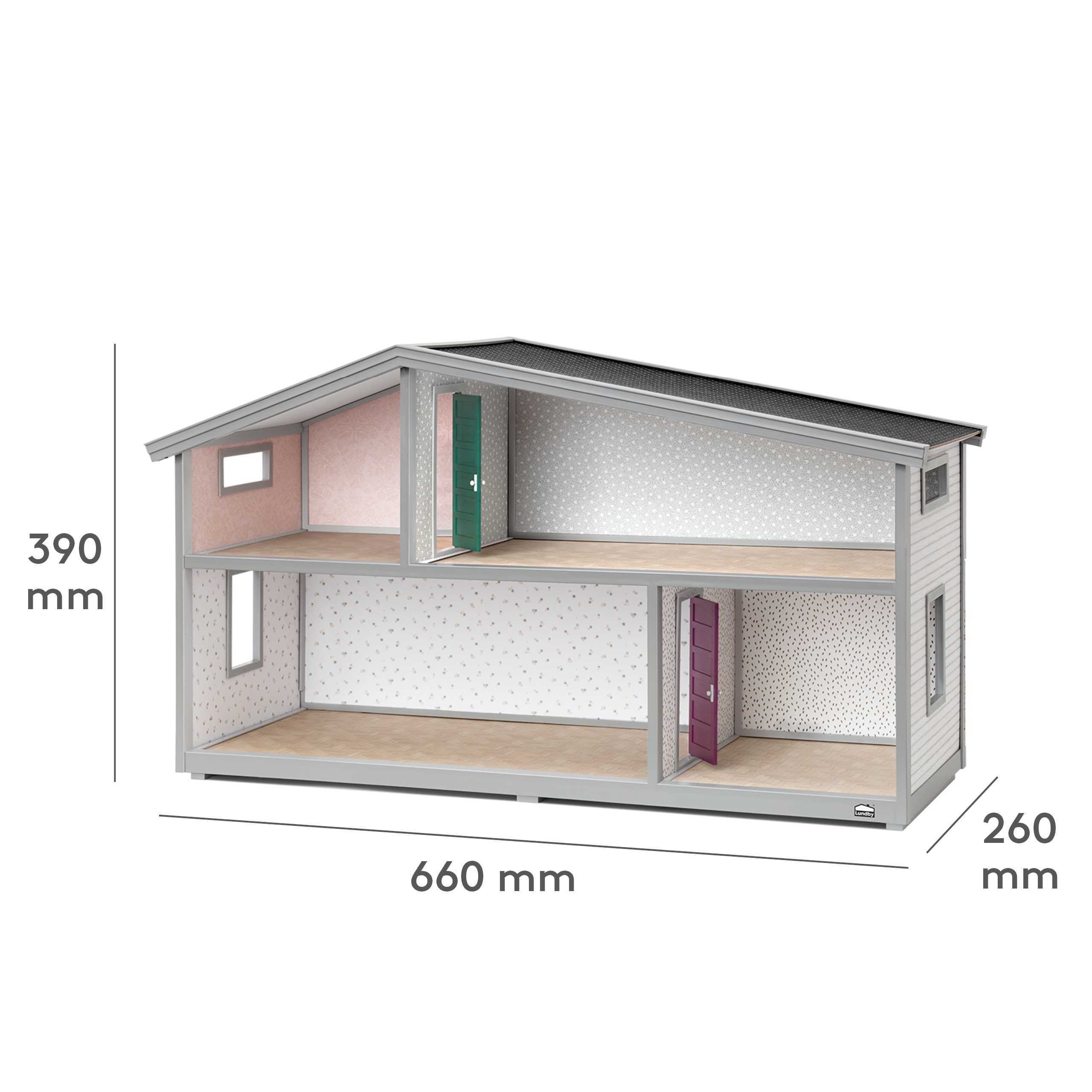 Zabawka ma dwie kondygnacje, dwuspadowy dach, 4 pokoje z otwartym planem udekorowane prawdziwymi artystycznymi tapetami szwedzkiej marki Sandberg w pastelowych kolorach, okna oraz różnokolorowe drzwi. Wysuwane tylne ściany dają możliwość zabawy z dwóch stron. Dodatkowo tylne ściany dolnej kondygnacji są tapetowane dwustronnie, dzięki czemu po odwróceniu stanowią przepiękną, ozdobioną motywem roślinnym ścianę ozdobną.