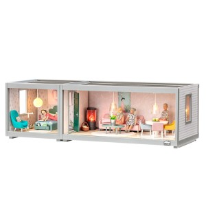 Zabawka zawiera kompaktowy domek dla lalek z wysuwanymi ścianami udekorowanymi artystycznymi tapetami szwedzkiej marki Sandberg w pastelowych kolorach oraz dwa okna i drzwi.