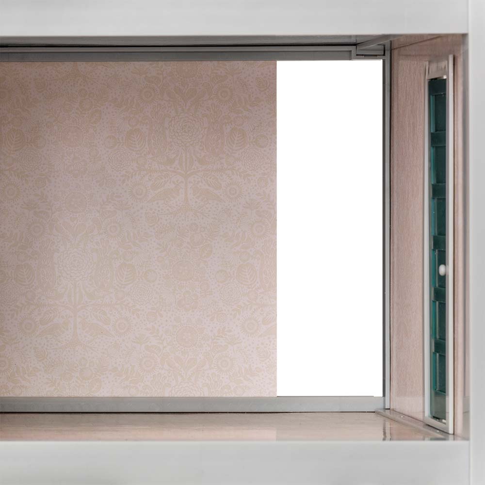 Zabawka zawiera kompaktowy domek dla lalek o wymiarach 22 cm z wysuwanymi ścianami udekorowanymi artystycznymi tapetami szwedzkiej marki Sandberg w pastelowych kolorach. Jest również okno i drzwi.
