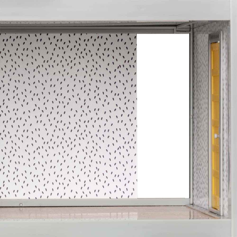 Zabawka zawiera kompaktowy domek dla lalek o wymiarach 33 cm z wysuwanymi ścianami udekorowanymi artystycznymi tapetami szwedzkiej marki Sandberg w neutralnych kolorach. Jest również okno i drzwi.