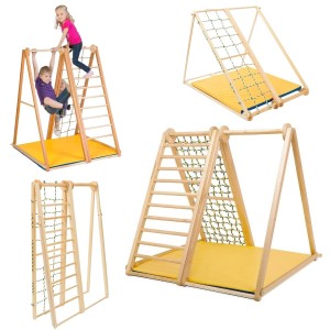 - Drewniana konstrukcja Zebra z klasycznymi szczebelkami i siatką wspinaczkową.
