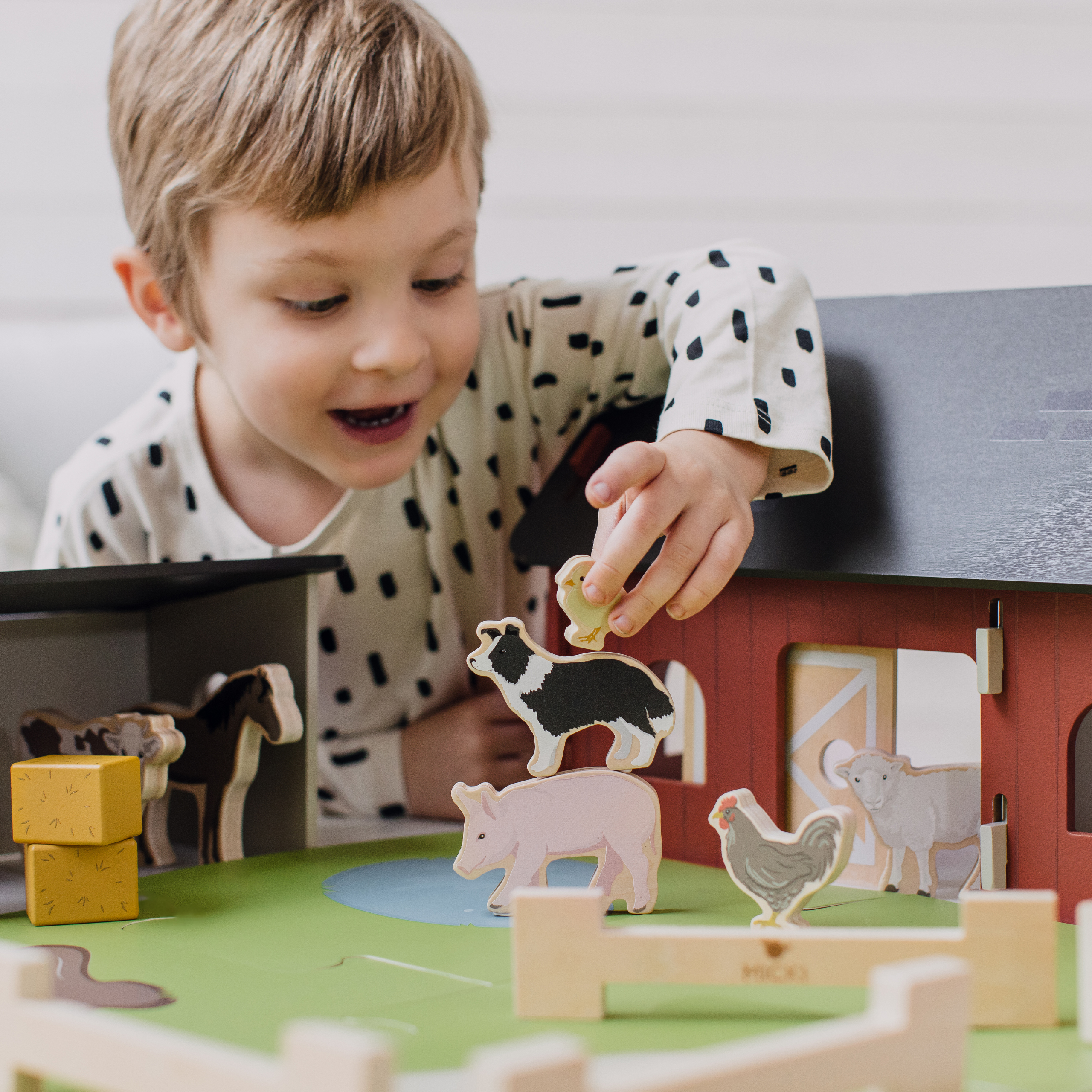 Klasyczna szwedzka drewniana farma Micki to uroczy zestaw w stylu skandynawskim, który zachwyci dzieci nieskończoną ilością scenariuszy zabawy. Zestaw obejmuje wszystko, co jest potrzebne do stworzenia pełnego radości życia na farmie. W komplecie znajdują się: stodoła, stajnia, 7 uroczych drewnianych zwierzątek, stogi siana, płotki i mata imitująca prawdziwe wiejskie podwórko. Radosny design zaprasza do odgrywania ról, opowiadania historii, gwarantuje udaną zabawę i wspiera prawidłowy rozwój Twojego dziecka.