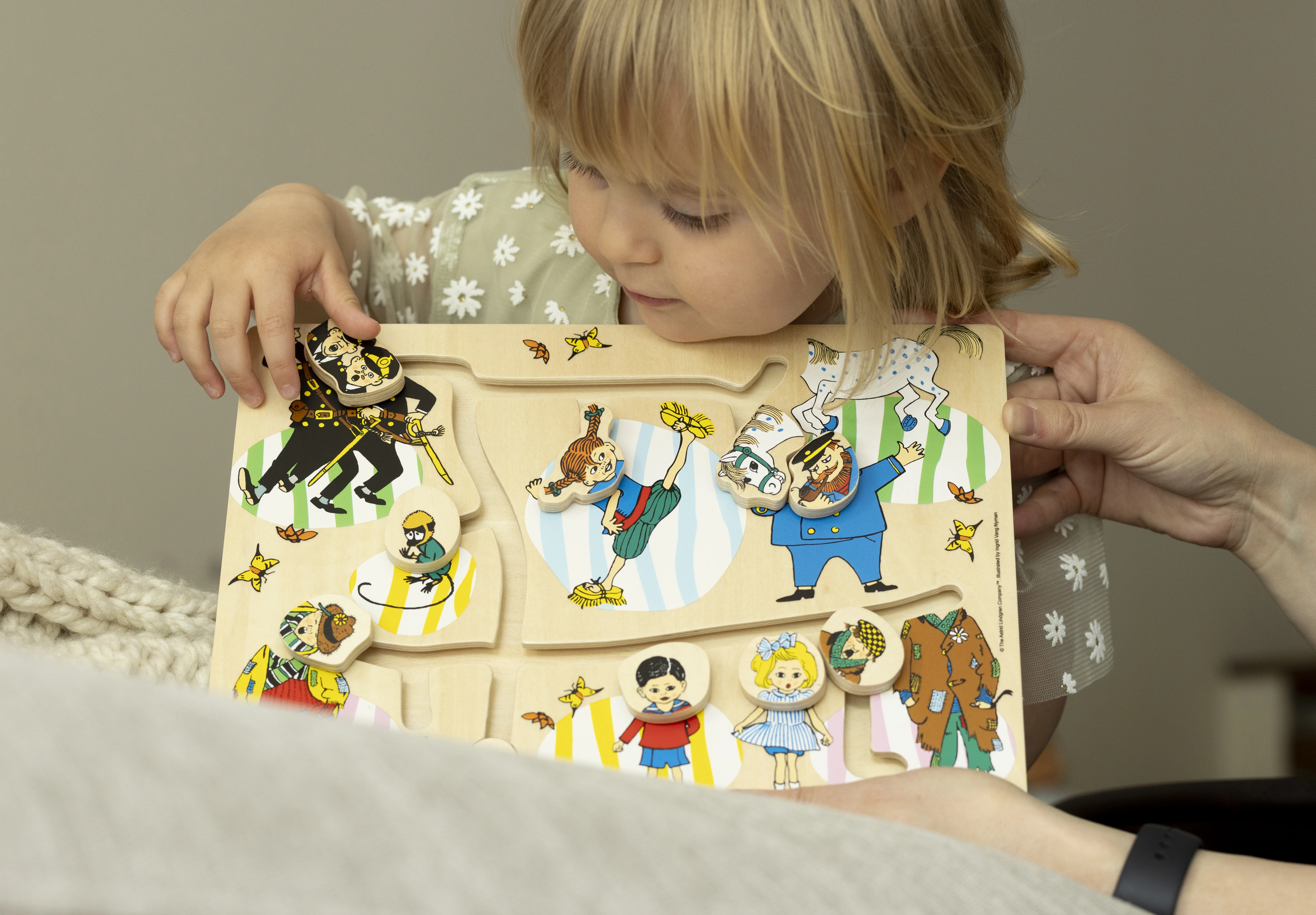 Urocza układanka dla dzieci zawiera tablicę z labiryntem i 9 głów postaci do przesuwania. Została zaprojektowana w Szwecji i starannie wykonana z drewna na podstawie oryginalnych ilustracji z książki o perypetiach rezolutnej rudowłosej dziewczynki. Zaprasza dzieci do edukacyjnej zabawy i zdobywania nowych doświadczeń w świecie przygód uroczej bohaterki, którą kochają. Ruchome elementy zabawki są dostosowane do małych rączek dziecka i ćwiczą zręczność.