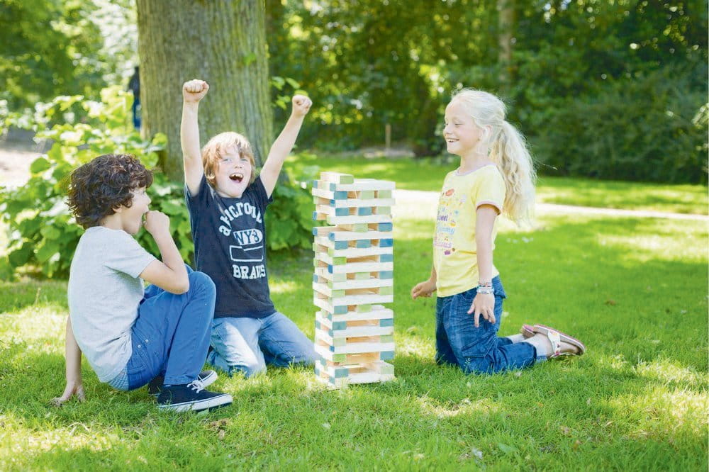 Wieża bs toys buiten speel z drewnianych klocków w rozmiarze XL z kostką - spróbuj swoich sił z naprawdę dużą Jengą.
