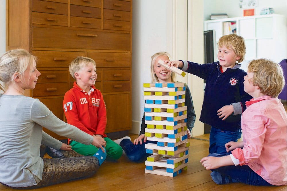 Drewniana wieża z klocków w rozmiarze XL to fantastyczna gra zręcznościowa dla całej rodziny. Zabawa polega na tym, aby wyjmować klocki w taki sposób, by nie zburzyć wieży. O tym, jakiego koloru klocek należy wyjąć, decyduje rzut kostką. Wyjęty klocek kładziemy na górze konstrukcji. Przegrywa ta osoba, po której ruchu wieża przewróci się. Maksymalna wysokość wieży w tym wariancie to aż 100 cm. Świetna zabawa dla dzieci już od 4 roku życia.