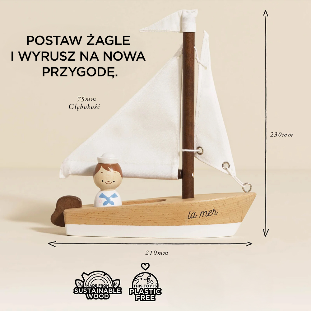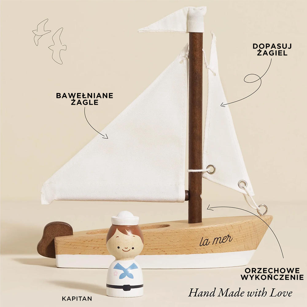 Pełna ponadczasowego uroku drewniana żaglówka została stworzona z drewna bukowego, wyposażona w bawełniane białe żagle i flagę, z uroczą figurką żeglarza na pokładzie. Ozdobiona białą farbą i orzechową bejcą do drewna z zastosowaniem wyłącznie bezpiecznych dla maluchów farb na bazie wody, bez grama plastiku, stanowi wspaniałą zabawkę i fantastyczny element dekoracyjny każdego wnętrza. Zabawa z żaglówką rozwija koordynację ruchową, motorykę, koordynację ręka-oko, a także zachęca do odgrywania ról i tworzenia ciekawych historii. Popatrz jak żagle powiewają na wietrze, napędzając łódkę ku niekończącym się przygodom!