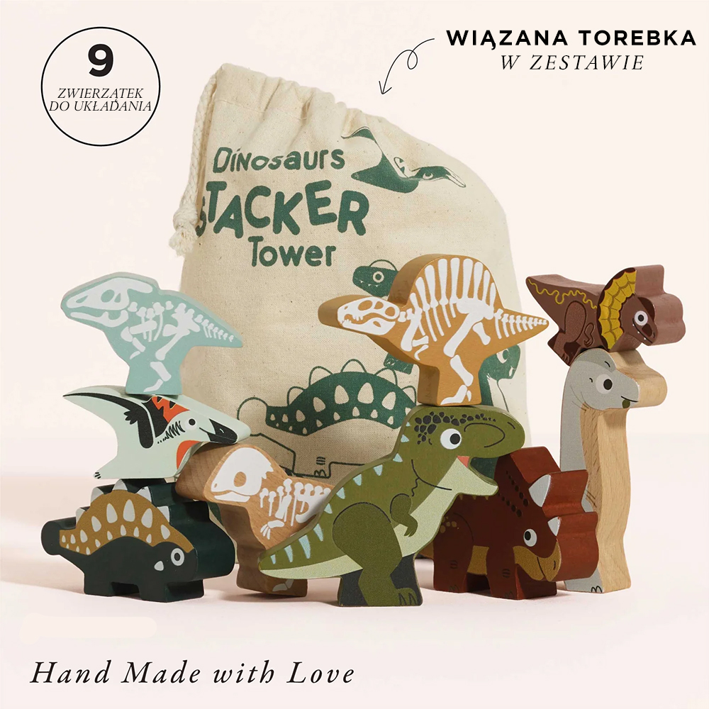 Zapakowany w bawełniany woreczek zestaw 9 drewnianych dinozaurów do układania pionowo i poziomo umożliwia zabawę w dowolnym miejscu. Ustawiaj figurki i doskonal umiejętność koordynacji lub wykorzystaj je w pomysłowych scenariuszach innych zabaw. Obserwuj, jak ciekawość i wyobraźnia się rozwijają, gdy maluch odkrywa prehistoryczny świat dinozaurów!