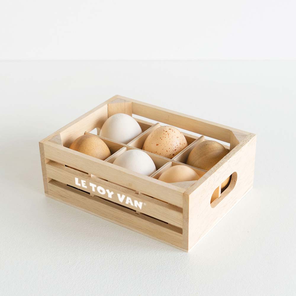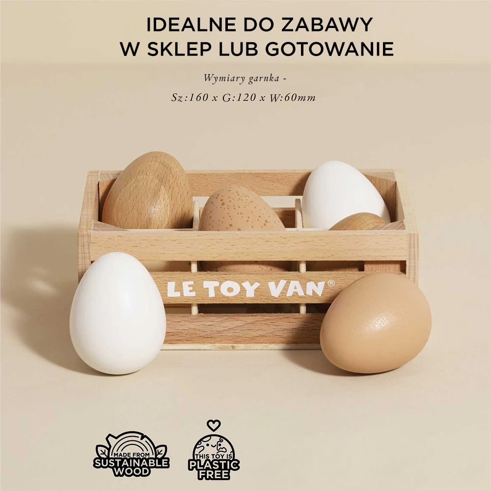 Drewniane jajka w skrzynce, zabawka dla dzieci, stragan sklep Le Toy Van