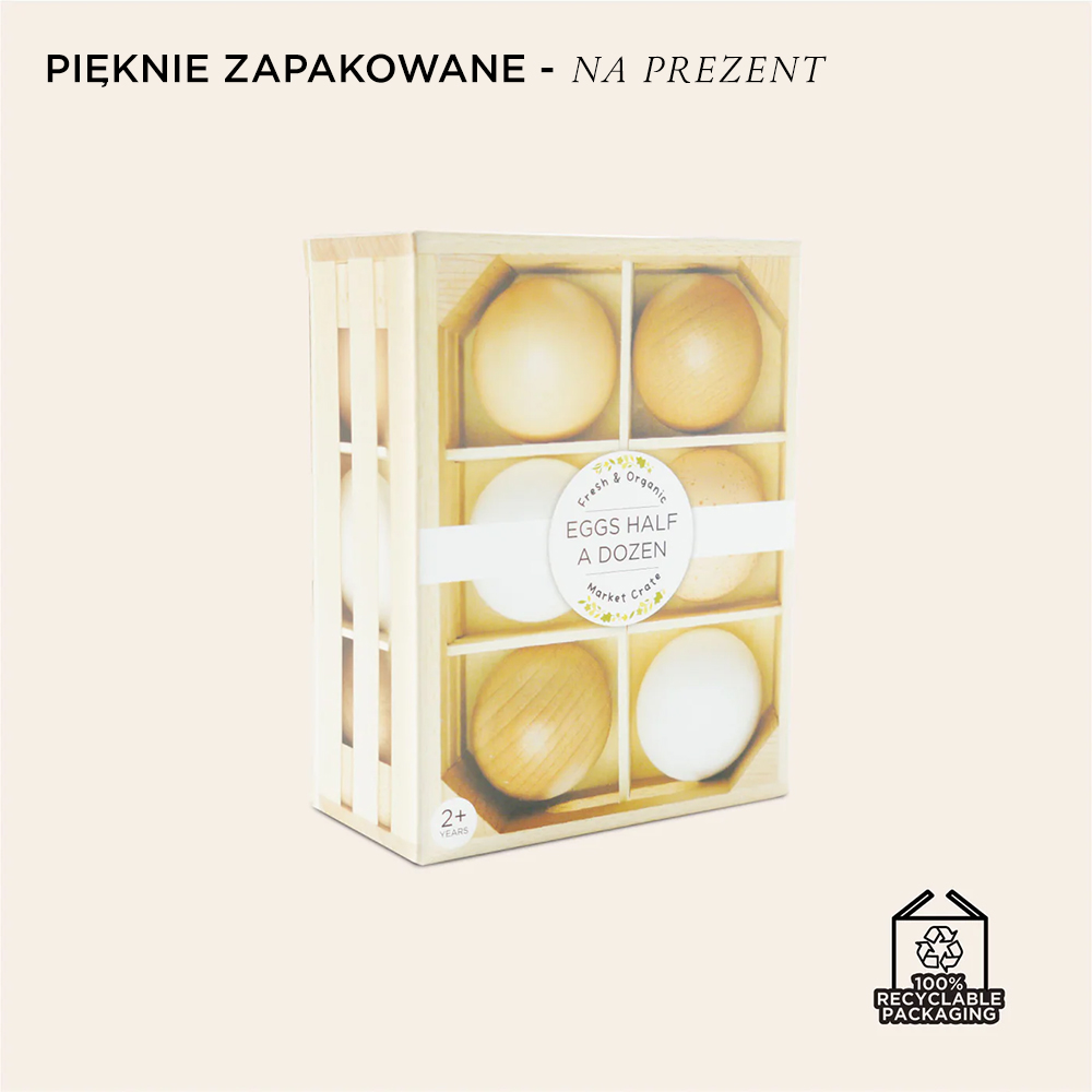 Niesamowita drewniana zabawka - skrzynka pełna świeżych jajek jest fantastycznym elementem zabawy w sklep lub w gotowanie. Ma doskonale dopasowane kształty do chwytania przez małe rączki, rozwija koordynację ruchową i doskonali motorykę, a przy tym uczy zdrowych nawyków żywieniowych.