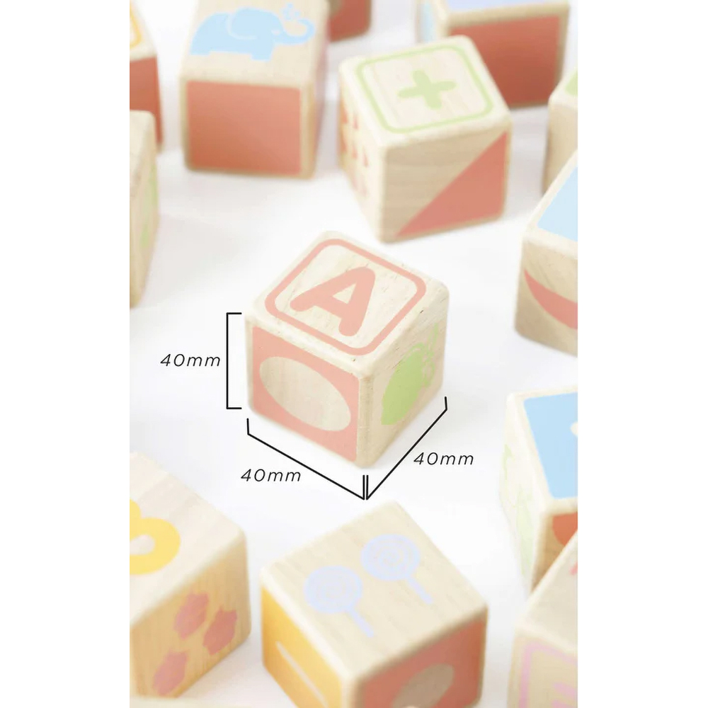 Drewniane klocki mają kształt sześcianów, których wszystkie ścianki zostały ozdobione kolorowymi literami, cyferkami, znakami specjalnymi, kształtami i ilustracjami. Świetnie sprawdzają się zarówno jako klocki do budowania oraz jako wprowadzenie do nauki pisowni oraz liczenia.