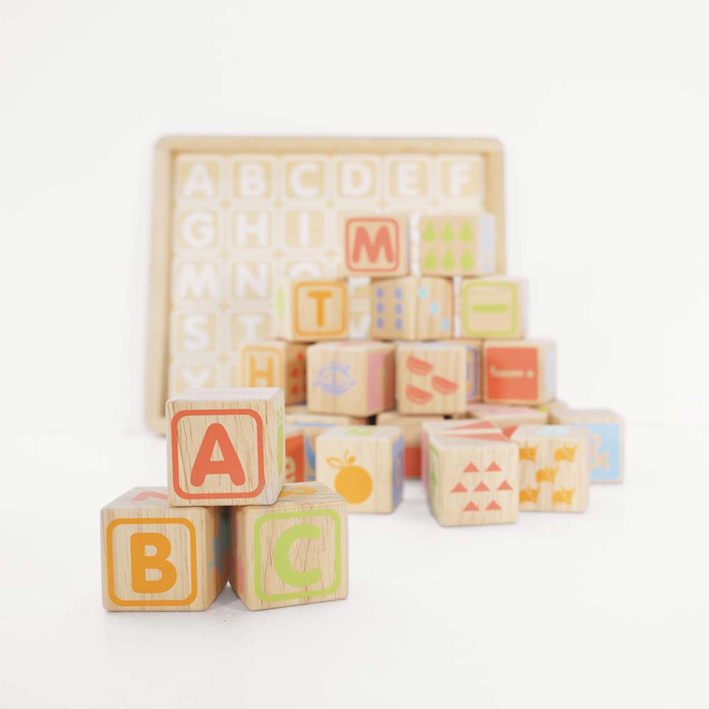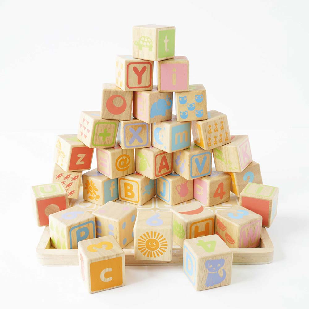 Zestaw zawiera 30 drewnianych klocków oraz tacę z wyrysowanymi literkami, dzięki czemu po skończonej zabawie można je wszystkie odłożyć na miejsce i oferuje nieograniczone możliwości nauki, zabawy oraz kreatywnego budowania różnych konstrukcji.