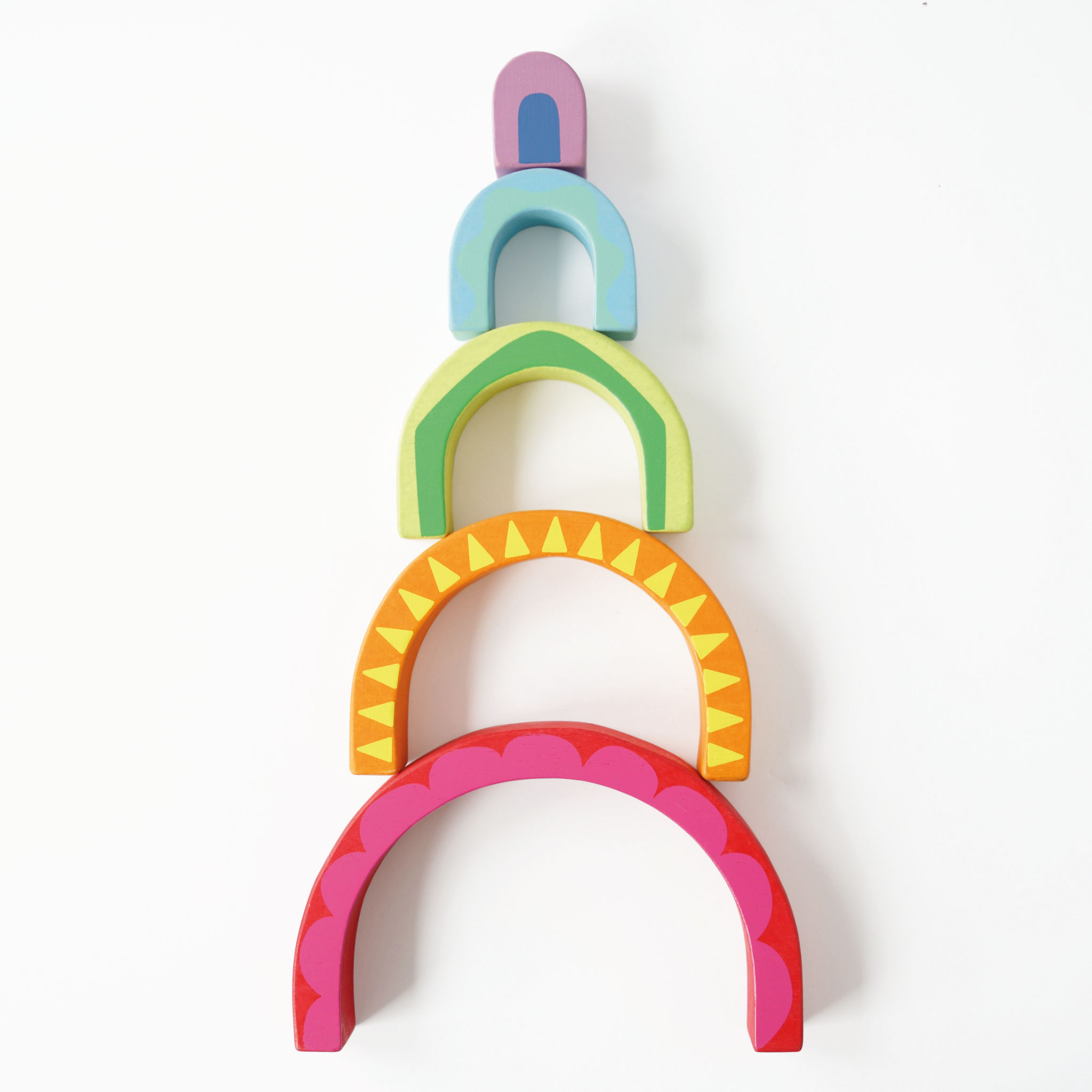 Kolorowa zabawka edukacyjna w kształcie tęczowego tunelu zapewnia maluchowi mnóstwo ciekawych doznań stymulujących jego młody umysł. Zainspirowana metodą Montessori składa się z 5 drewnianych klocków w kolorach tęczy ozdobionych wzorkami do układania poziomo i pionowo. Twoje dziecko może ułożyć tęczę, tunel, budować z nich wieżę lub bawić się tak, jak mu podpowie jego wyobraźnia. Może też stworzyć z klocków oryginalny element dekoracyjny. Ta drewniana układanka uczy rozpoznawania kolorów, rozwija zręczność i koordynację wzrokowo-ruchową oraz angażuje wszystkie zmysły Twojego dziecka.