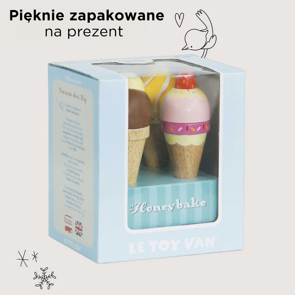 Zestaw świetnie się sprawdzi jako dodatek do lodziarni lub wózka na herbatę z nagradzanej kolekcji Honeybake marki Le Toy Van sprzedawanych osobno. Dla jeszcze większej frajdy z zabawy, odkryj gamę kuchni Le Toy Van. Wszystkie zabawki marki są tworzone, aby przetrwać lata. Zostały starannie zaprojektowane i wykonane przez wykwalifikowanych rzemieślników z wykorzystaniem etycznych praktyk i zrównoważonych materiałów.