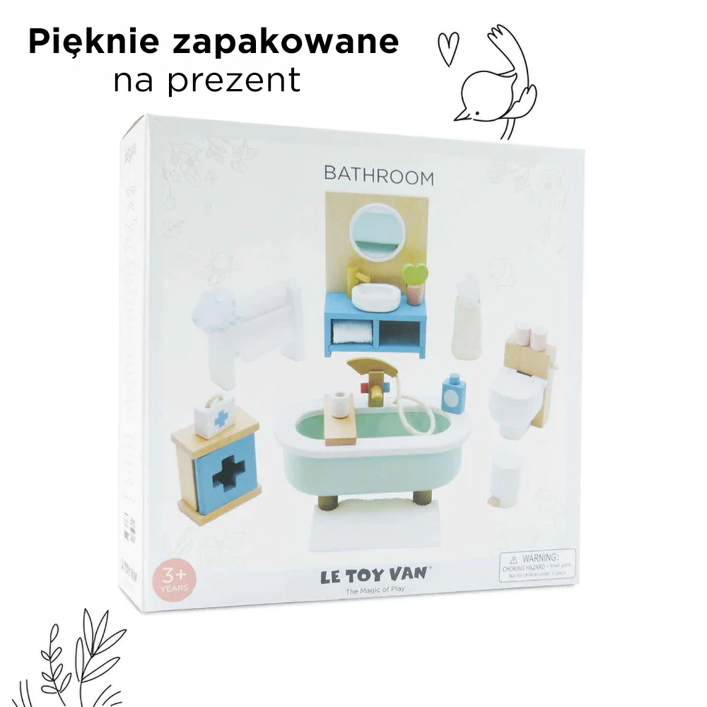 Nowoczesny zestaw mebli i akcesoriów łazienkowych do domku dla lalek Daisylane zawiera piękną wolnostojącą wannę, stojak na ręczniki, toaletę, umywalkę, szafkę apteczną oraz różnorodne akcesoria, dzięki którym mali lokatorzy będą mogli kompleksowo o siebie zadbać. Rozmiar mebelków idealnie pasuje do innych mebli, lalek i domków dla lalek marki Le Toy Van. Ta zabawka pobudza wyobraźnię, poprawia zręczność i doskonali umiejętności motoryczne Twojego dziecka. Atrakcyjny design i staranne wykonanie z uwzględnieniem wszystkich detali gwarantują długie godziny kreatywnej zabawy, odgrywania ról i tworzenia zupełnie nowych historii z ukochanymi lalkami w rolach głównych.