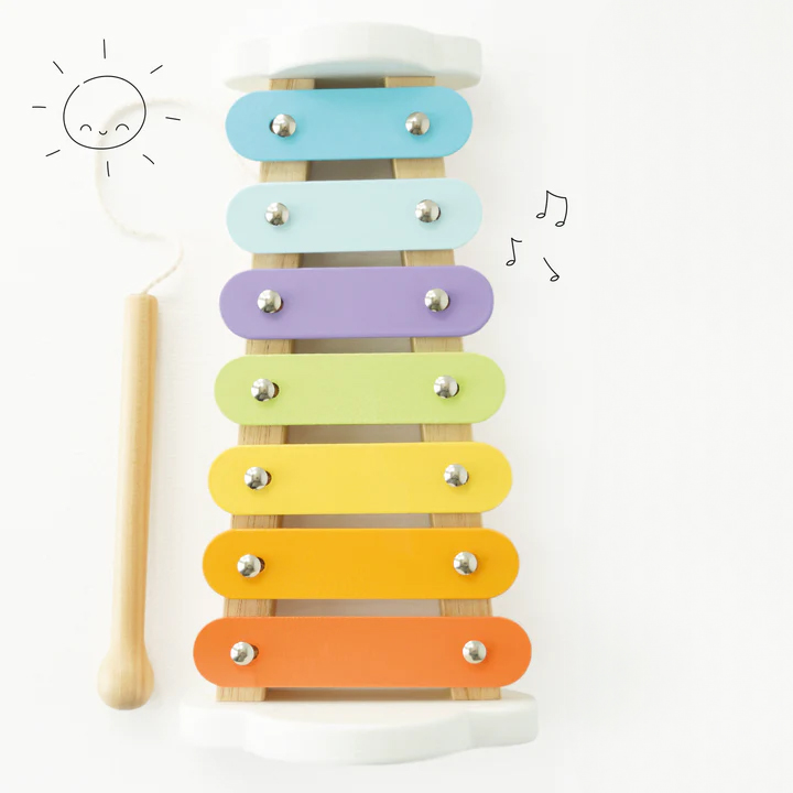 Przepiękne kolorowe cymbałki to obowiązkowa pozycja na liście ulubionych zabawek każdego malucha. Ta klasyczna zabawka uczy zręczności, doskonali chwyt i wprowadza w świat muzyki. Drewniane cymbałki z fantazyjnym motywem chmurek mają klawisze w kolorach tęczy, czym dodatkowo pobudzają wyobraźnię i zapraszają do kreatywnej zabawy. Tradycyjny, pierwszy instrument muzyczny Twojego dziecka nie zawiera plastiku i stanowi wspaniały, przemyślany prezent na każda okazję.