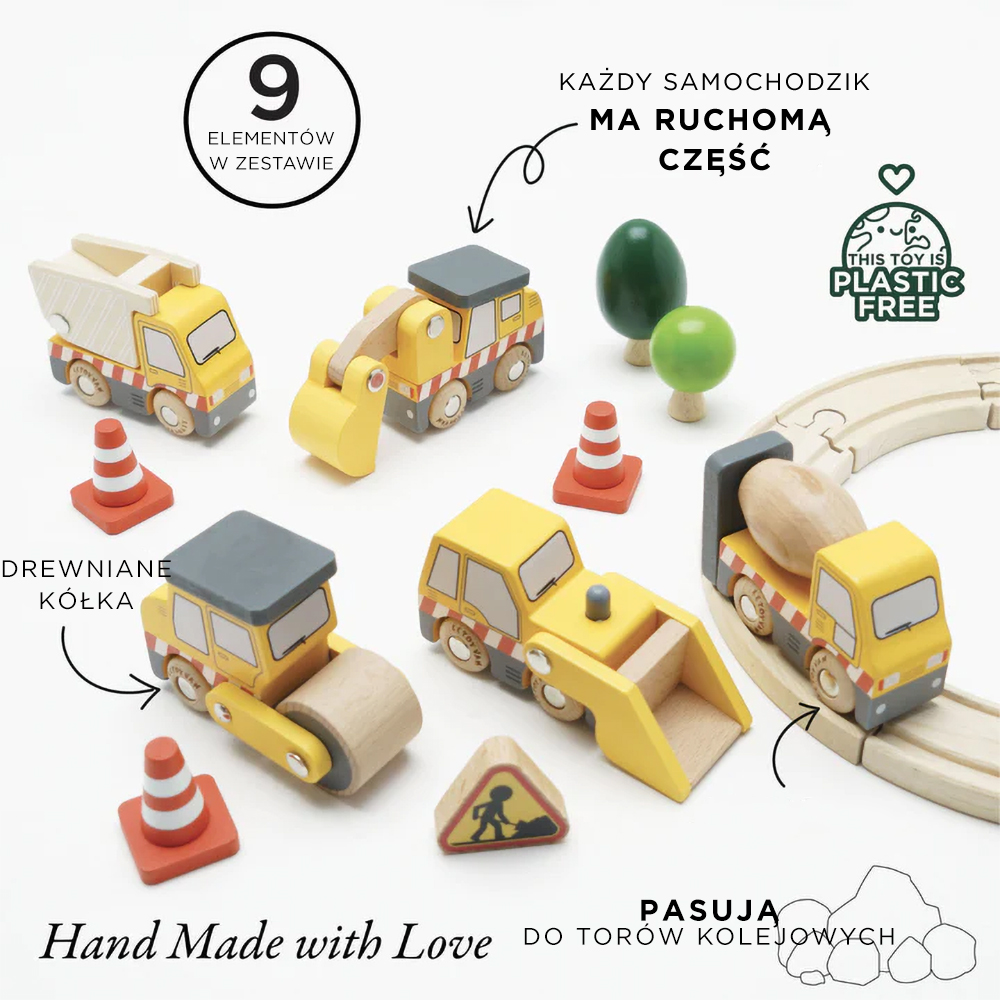 Zestaw ma ruchome elementy, został wykonany z drewna certyfikowanego przez FSC® i nie zawiera plastiku. Jest kompatybilny ze standardowymi torami kolejowymi i garażami. Zabawa tym zestawem rozwija koordynację ruchową, motorykę, a także zachęca do odgrywania ról i tworzenia ciekawych historii.