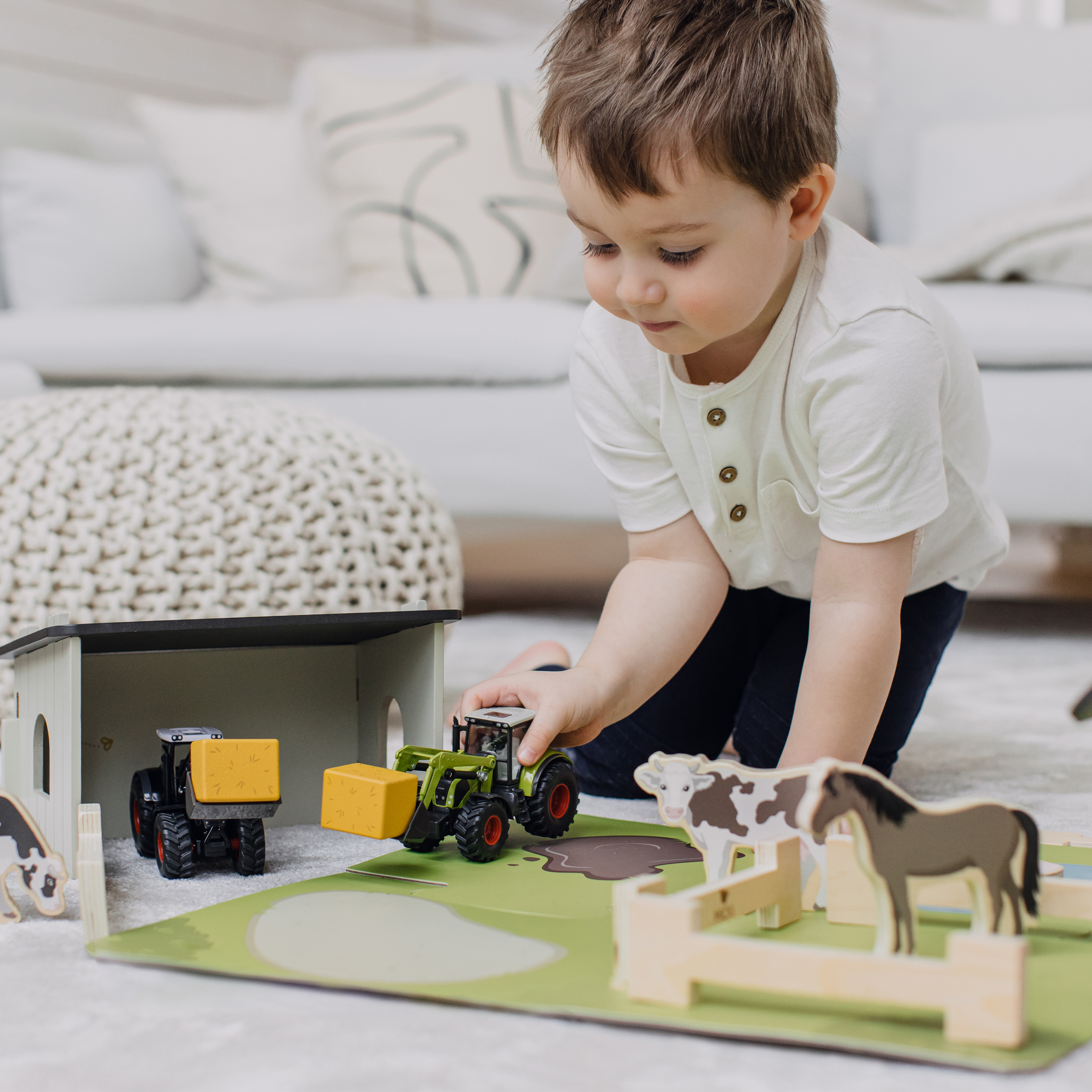 Figurki zostały wykonane z drewna certyfikowanego FSC, zaprojektowana w Szwecji tak, aby łączyć tradycję z nowoczesnym designem. Zestaw rozwija wyobraźnię, motorykę doskonali umiejętności poznawcze najmłodszych miłośników zwierząt. Zestaw pasuje do farmy sprzedawanej osobno.