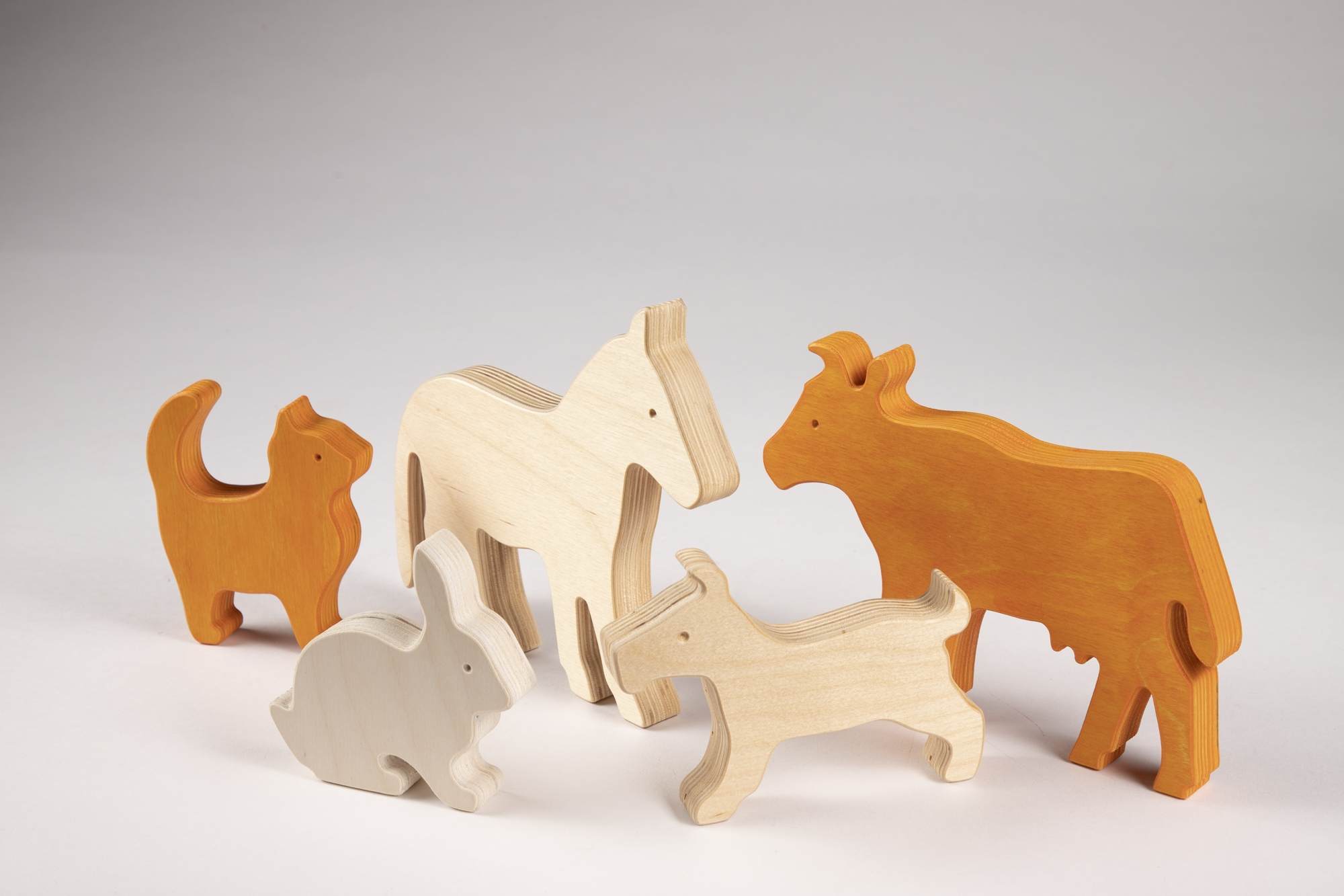 Drewniane zwierzątka edukacyjne PILCH to zestaw 5 figurek najpopularniejszych zwierzątek mieszkających w gospodarstwach domowych: konia, psa, królika, krowy i kota.